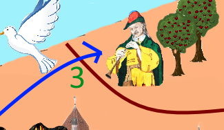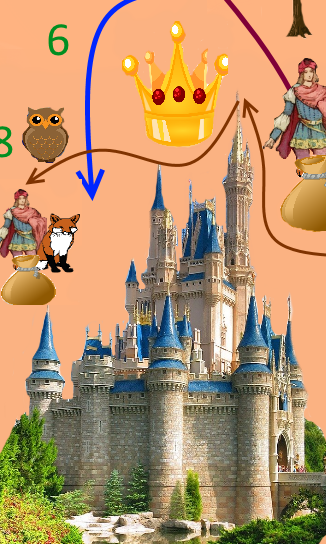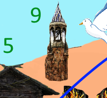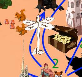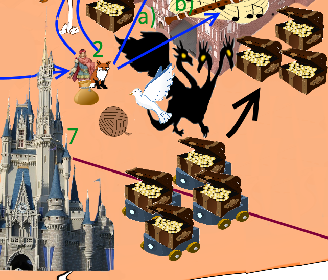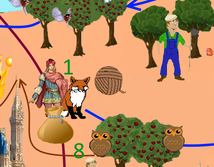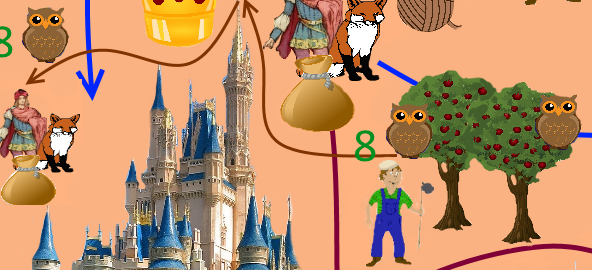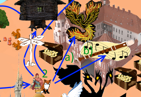 crown, clew, birds, castle on the right, castle in the middle, pigeon, tower, fluite, crossing sign, farmer, fox, flutist, izba, bag, map, owl, firebird, squirrel, prince, castle on the left, witch, trolley, coffers (with gold))
