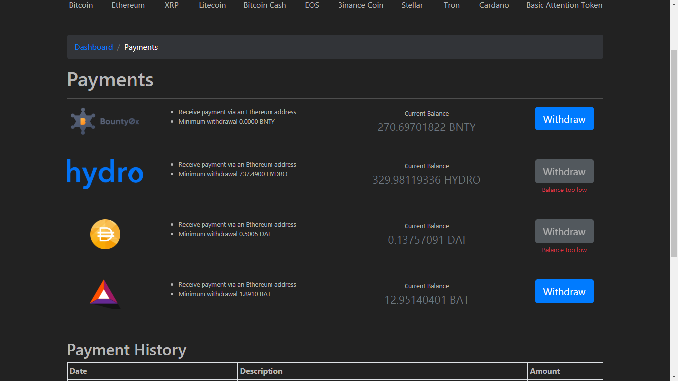 To withdraw your funds you’ll need to go to “Payments” section in the “Dashboard” (once you have enough for withdraw feature to be activated).