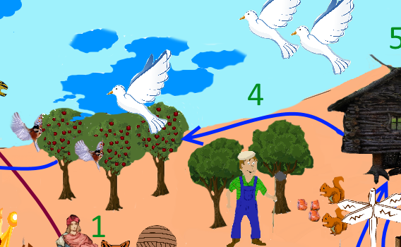 The Ambassador role is represented as a flutist (see the green number 3) because flutists (and other musicians) share their music (and stories) with the audience. Just like that, you will share URLs with people on different platforms to attract potential users to PublishOx. Also you can see apple trees (top right). That’s the potential content flutists could attract to PublishOx.