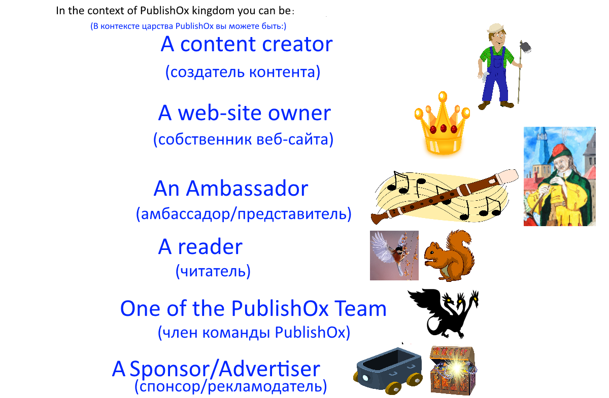 Note that the user is represented as Tsarevich Ivan, it’s just the roles he can play (and the skills he can demonstrate) are encoded as a farmer (Content Creator), a flutist (Ambassador) and a crown (Web-site Owner).
