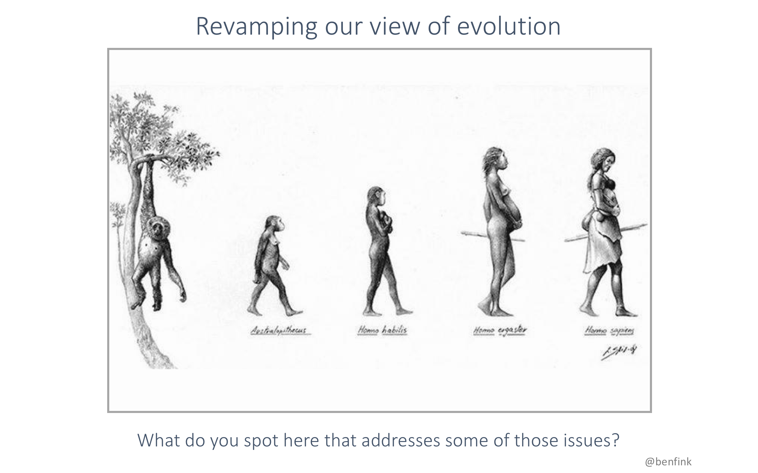 Fascinating to see how subtle (and not so subtle) racism permeated these evolutionary illustrations. That's not something I would have thought about at first glance... I really like your annotated diagrams. Very effective. Thanks for sharing @benfink!