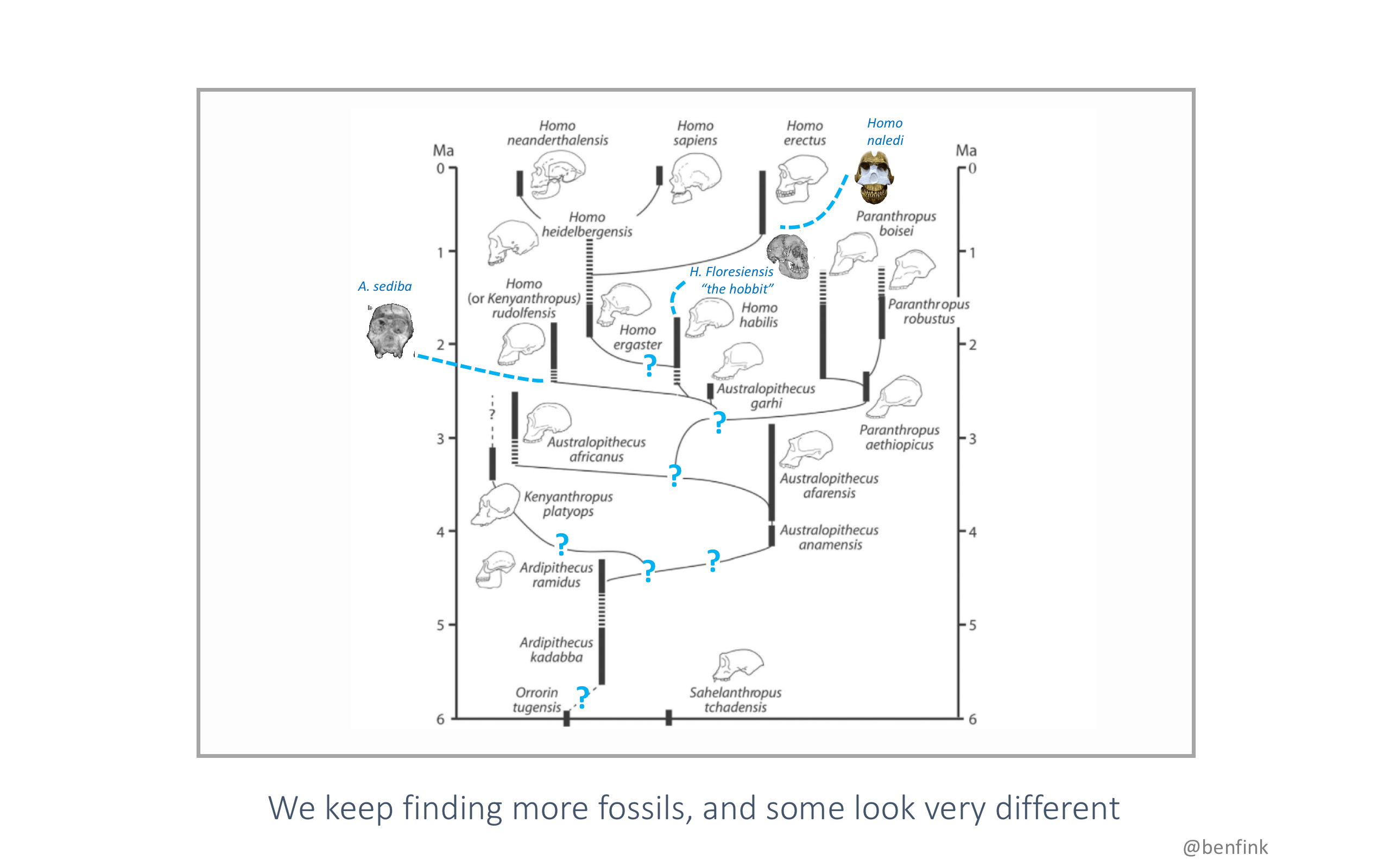 Every time we learn something new it just gets messier, which is cool and frustrating at the same time. The newest hominin, just described in 2015, is called Homo naledi.