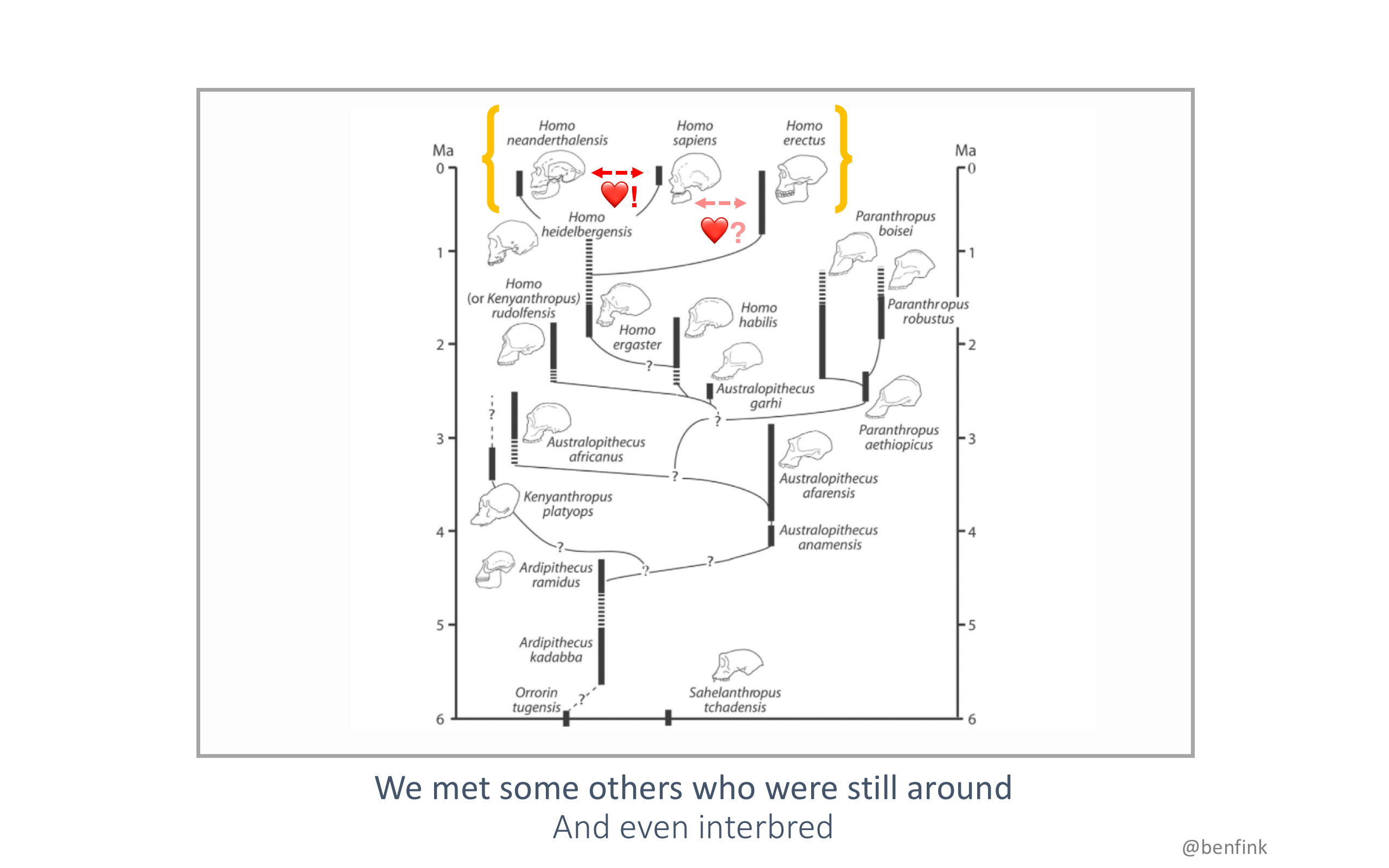 As humans dispersed out of Africa, they encountered what we call Archaic hominins like neanderthals. Modern genomics reveal that humans actually mated with these other hominins, and even cary their genes with us today. On average, non-Africans have about 2% of their genes from a neanderthal ancestor. We've even found evidence that humans mated with another hominin, the Denisovans (not pictured).