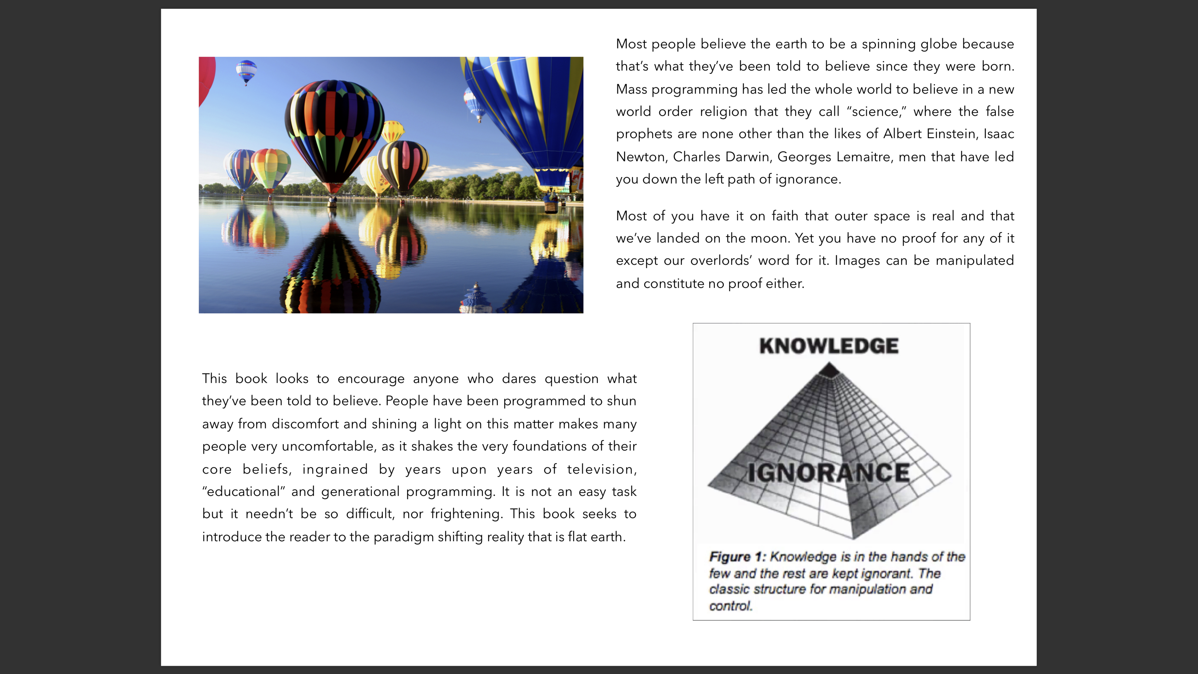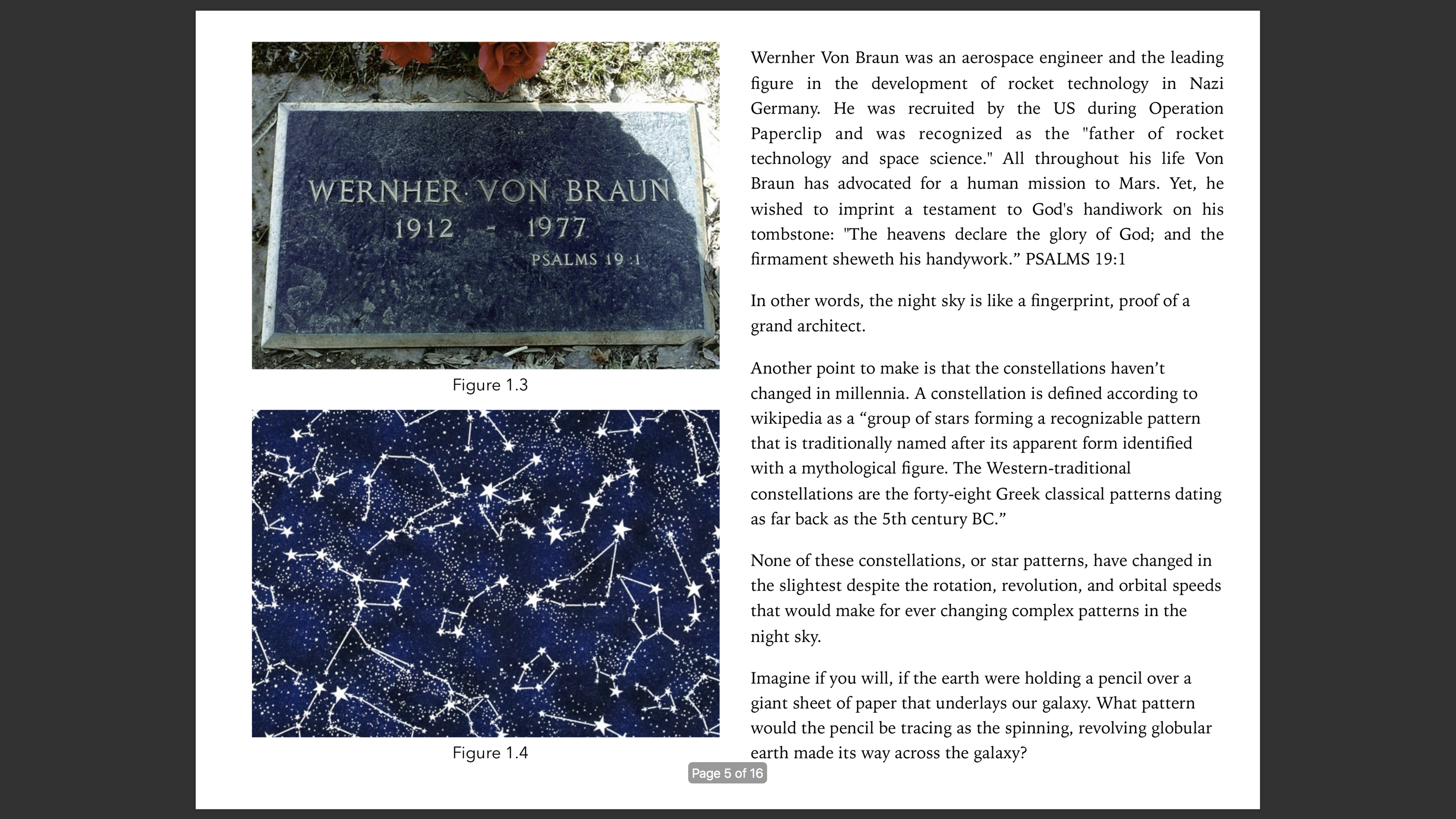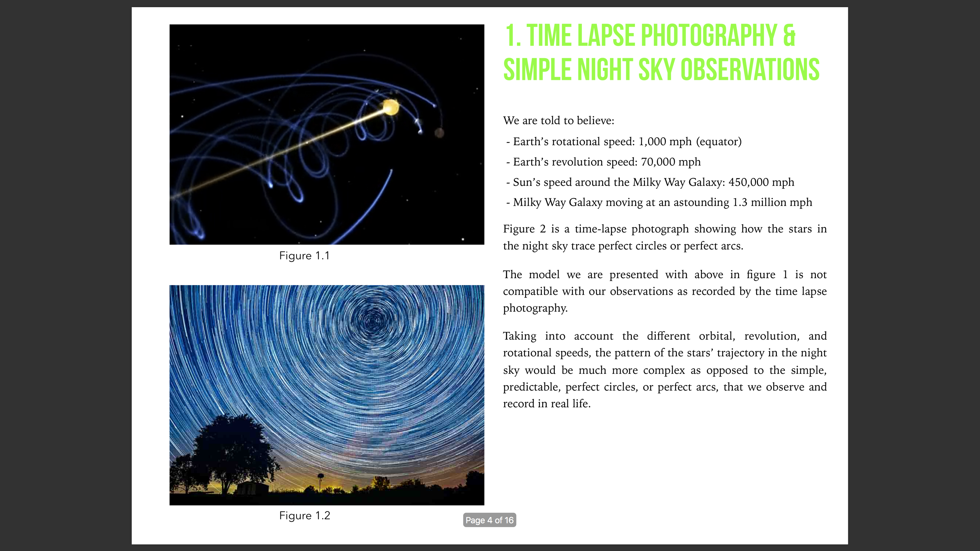 Figure 1.2 - I like that one. It's a perfect argument for the round, rotating and revolving Earth with the stars being far away - orders of magnitude farther than the Earth travel distances during the 24h cycle (so the startrail shapes are not really affected). At the same time, the perfectly circular shape of the star trails disprove the FE model with the stars fixed on the rotating literal, hemispherical firmament - the trails would be circular only if observed from the vicinity of the North Pole. From any other spot they'd track an oval (more elongated the farther from the North Pole You are). Ever thought about it?
