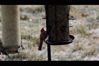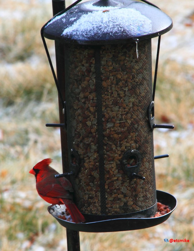 When I woke up Sunday, the bird feeder area was covered with snow.