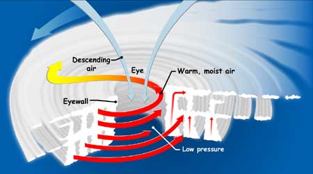 If you could slice into a tropical cyclone, it would look something like this. The small red arrows show warm, moist air rising from the ocean's surface, and forming clouds in bands around the eye. The blue arrows show how cool, dry air sinks in the eye and between the bands of clouds. The large red arrows show the rotation of the rising bands of clouds.