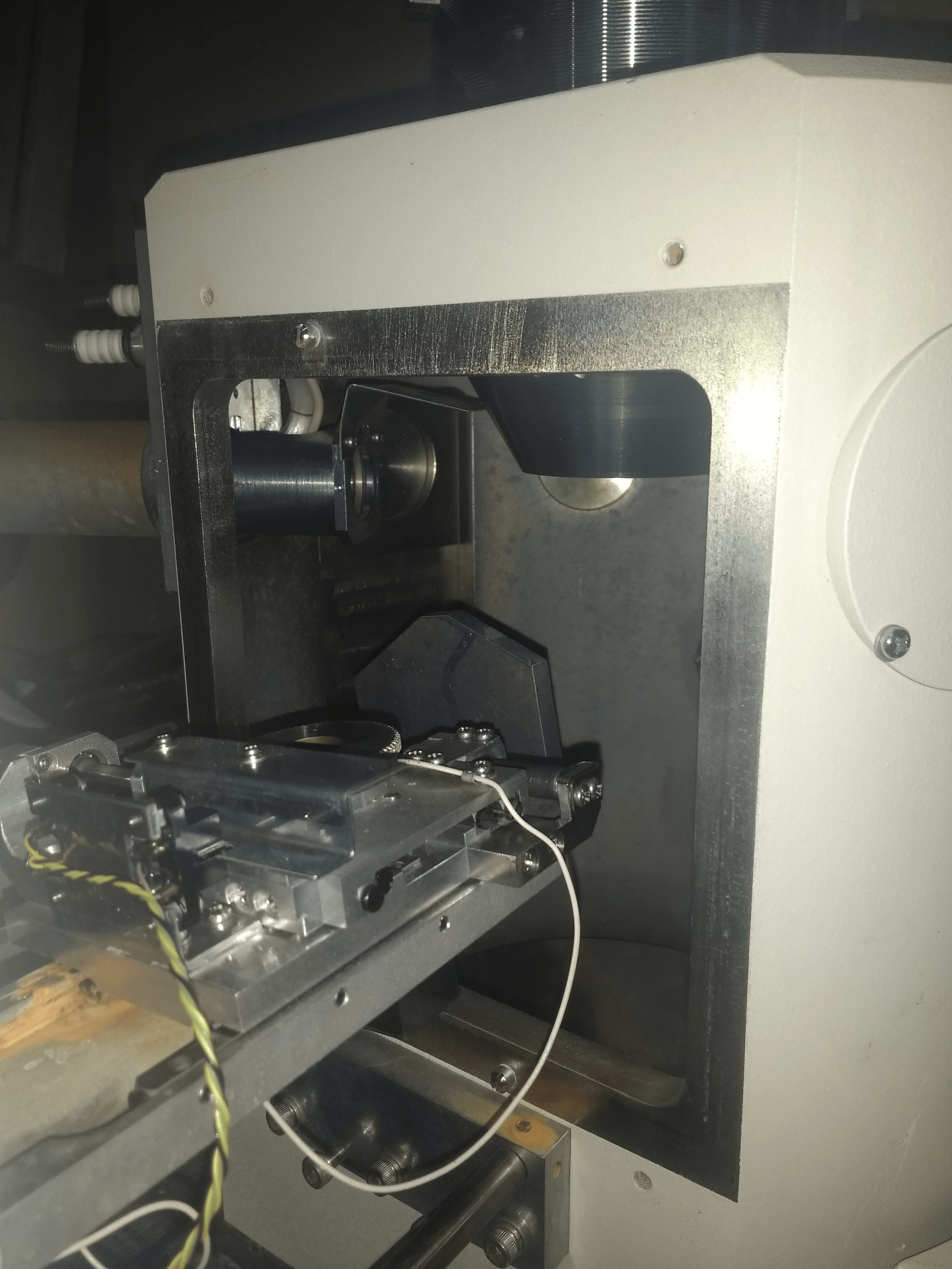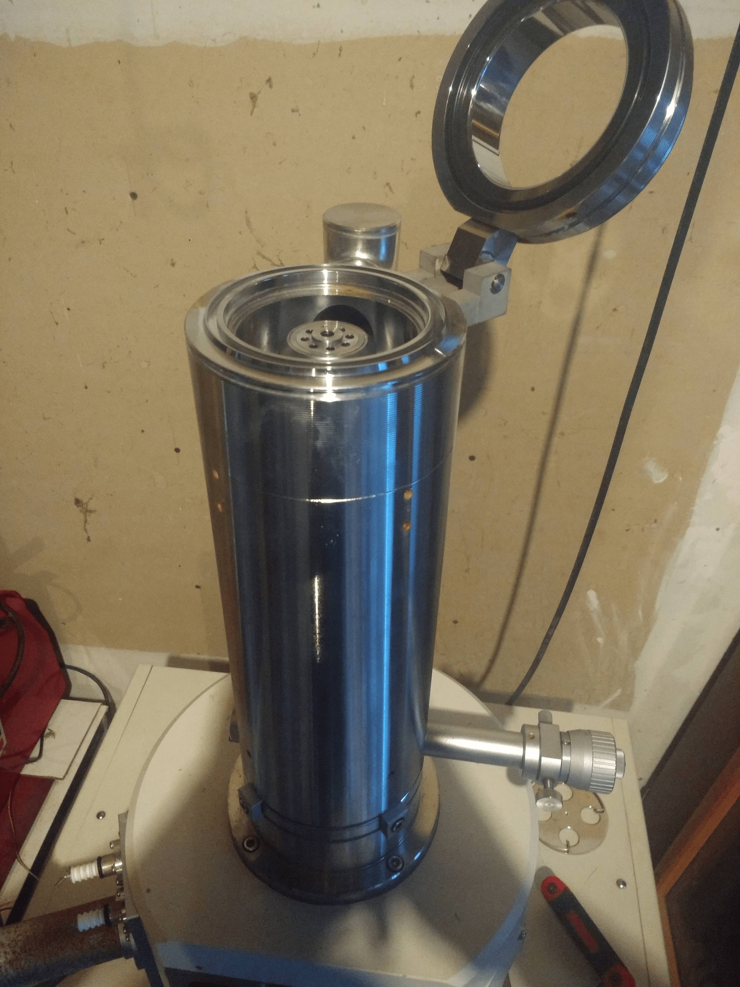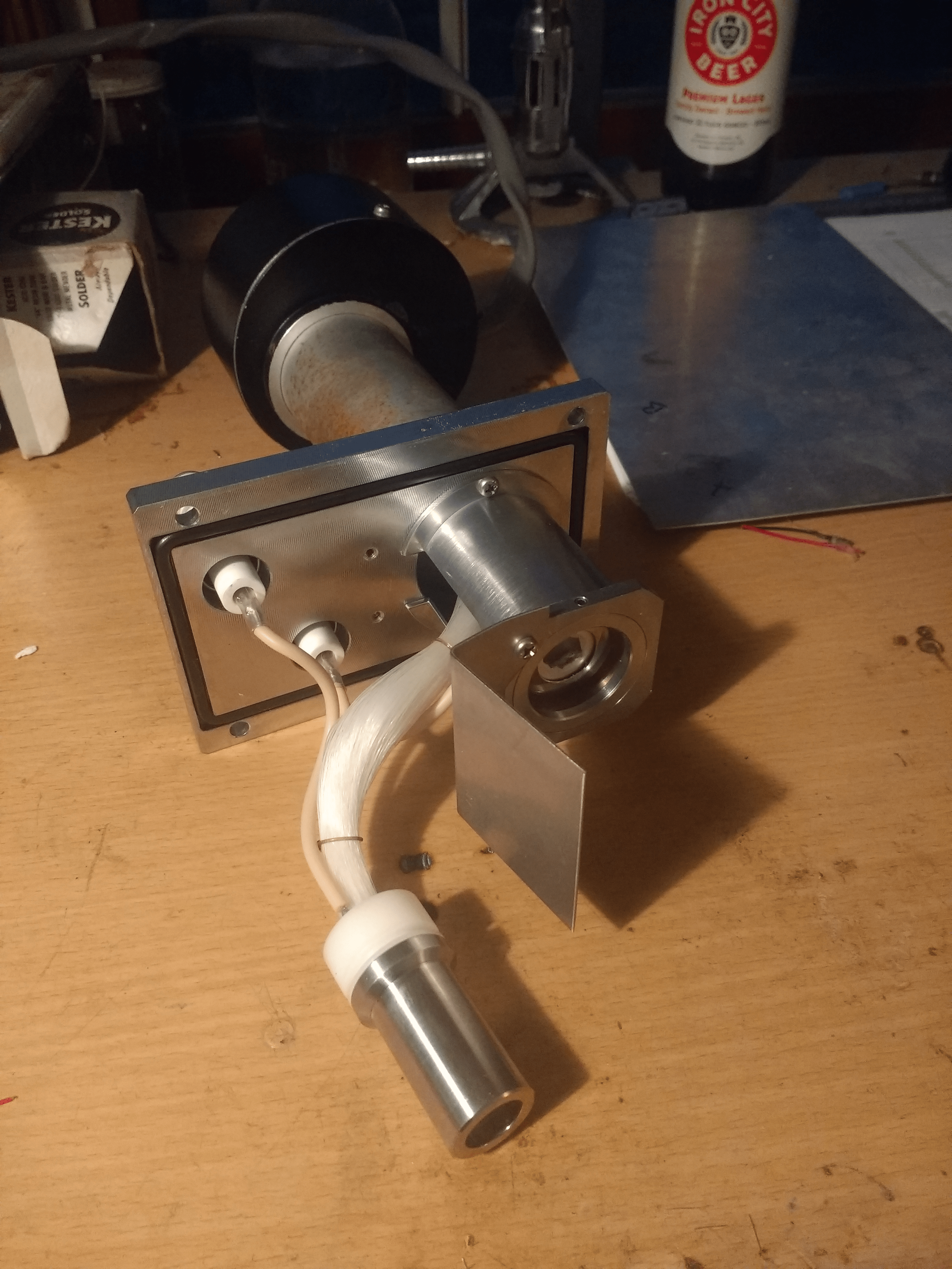 Figure 6. Backscatter detector removed from microscope column. The scintillation material was damaged at some point (white stuff in top part) and will need to be repaired.