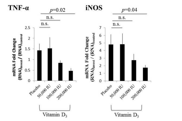 Here they were looking at the expression levels of these proteins based upon how much mRNA was being generated (remember mRNA is the instruction sheet telling the cell to make a protein, more mRNA = more protein generated, because there are more instructions floating around). What we can see here is that both of these proteins involved in the inflammatory response are reduced in expression levels as the amount of vitamin D supplemented goes up.