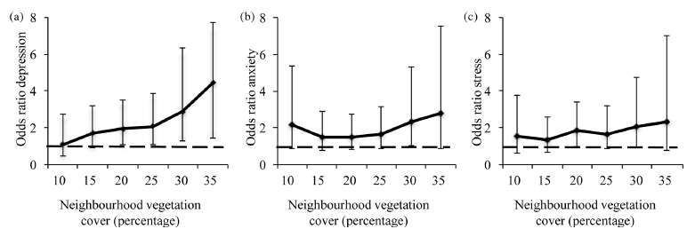 The second question was: is there an amount of "nature" that is needed to result in a mental health benefit? The biggest benefit was in having vegetation around, so they plotted the amount of vegetation against the odds of being either depressed, anxious or stressed.
