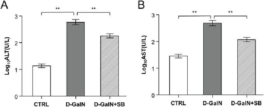 To look for the effects of liver damage the researchers monitored the blood levels of two liver enzymes: aspartate aminotransferase or (AST) and Serum alanine aminotransferase (ALT). The reason for this, is these two liver enzymes are normally found in very low levels in the blood, however if the liver is damaged, it ends up releasing them into the blood stream. In fact, testing for these enzymes is actually a common medical procedure looking for liver damage in us humans as well.[8]. So the researchers had three groups in the following experiment, a control which didn't receive any D-Galactosamine, a positive control which received D-Galactosamine but did not have the Saccharomyces boulardii (SB in the figure) in its microbiome and finally a mouse group which did.