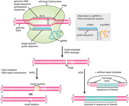 The DNA break induces the repair mechanisms of the host cell. The broken ends are joined together by Non Homology End Joining repair process (NHEJ) which is an error prone process leading to a small deletion or addition of sequence that forms gene sequence that isn't correct enough to regain its function and hence the target gene would be rendered ineffective.