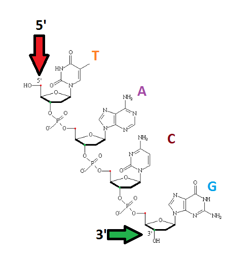 The enzyme DNA polymerase is able to add nucleotides together to create a growing chain of DNA. But, DNA polymerase can only add on nucleotides if one is already present, and it can only add them onto the 3’ end. This ultimately means that DNA replication can only progress in the 5’ to 3’ direction (annoyingly complicated ways to describe to direction of DNA) shown in figure 2.
