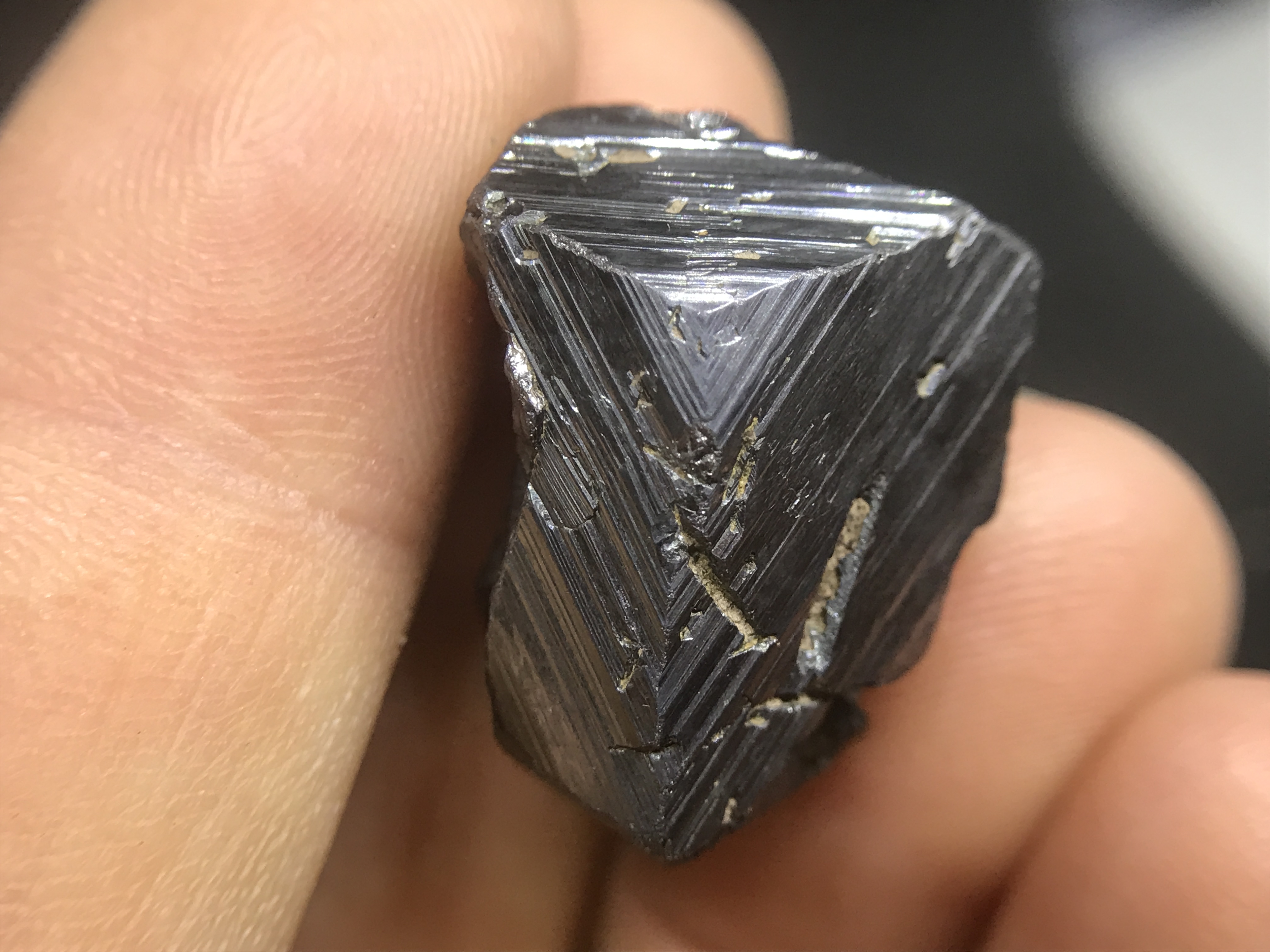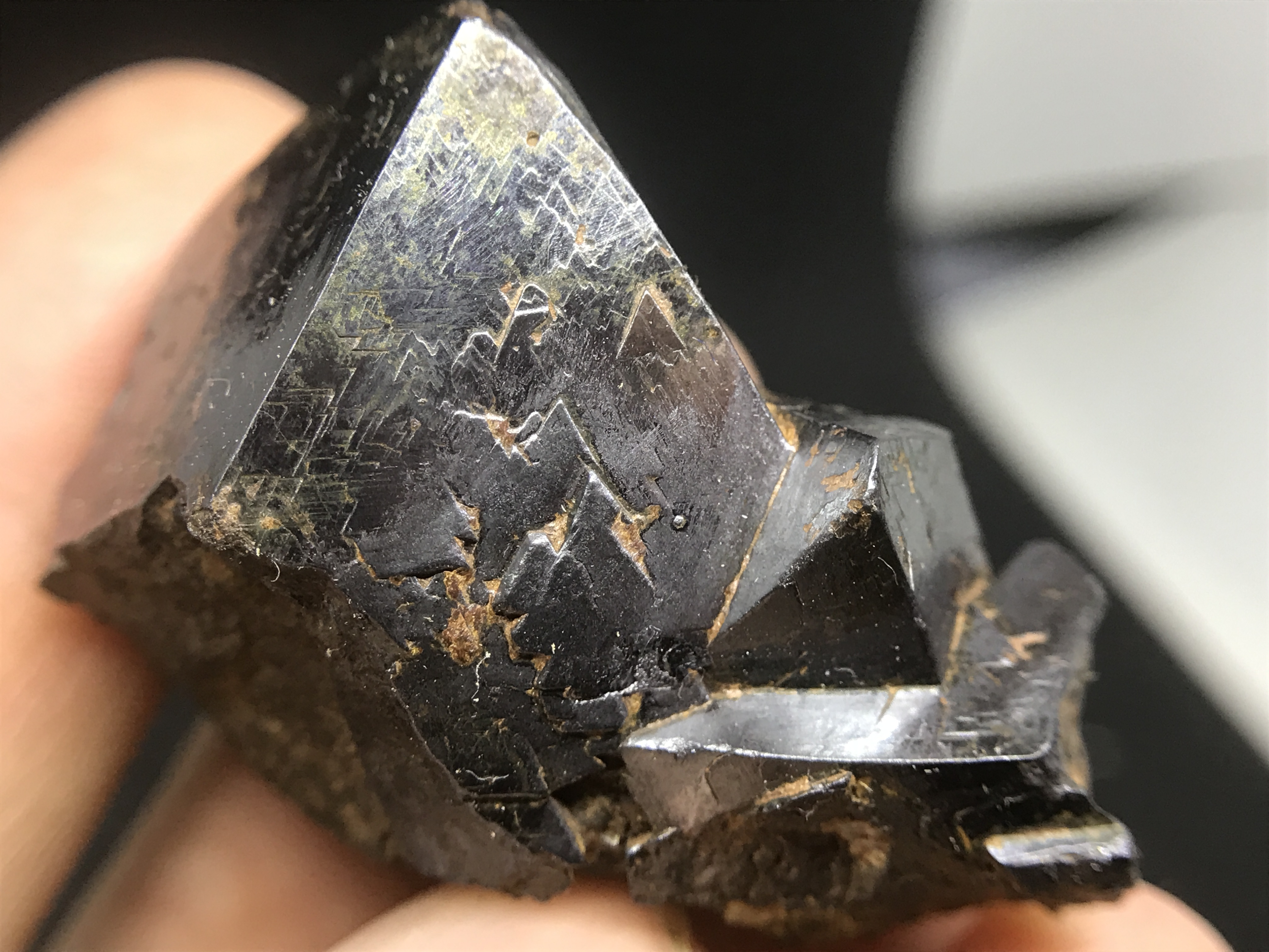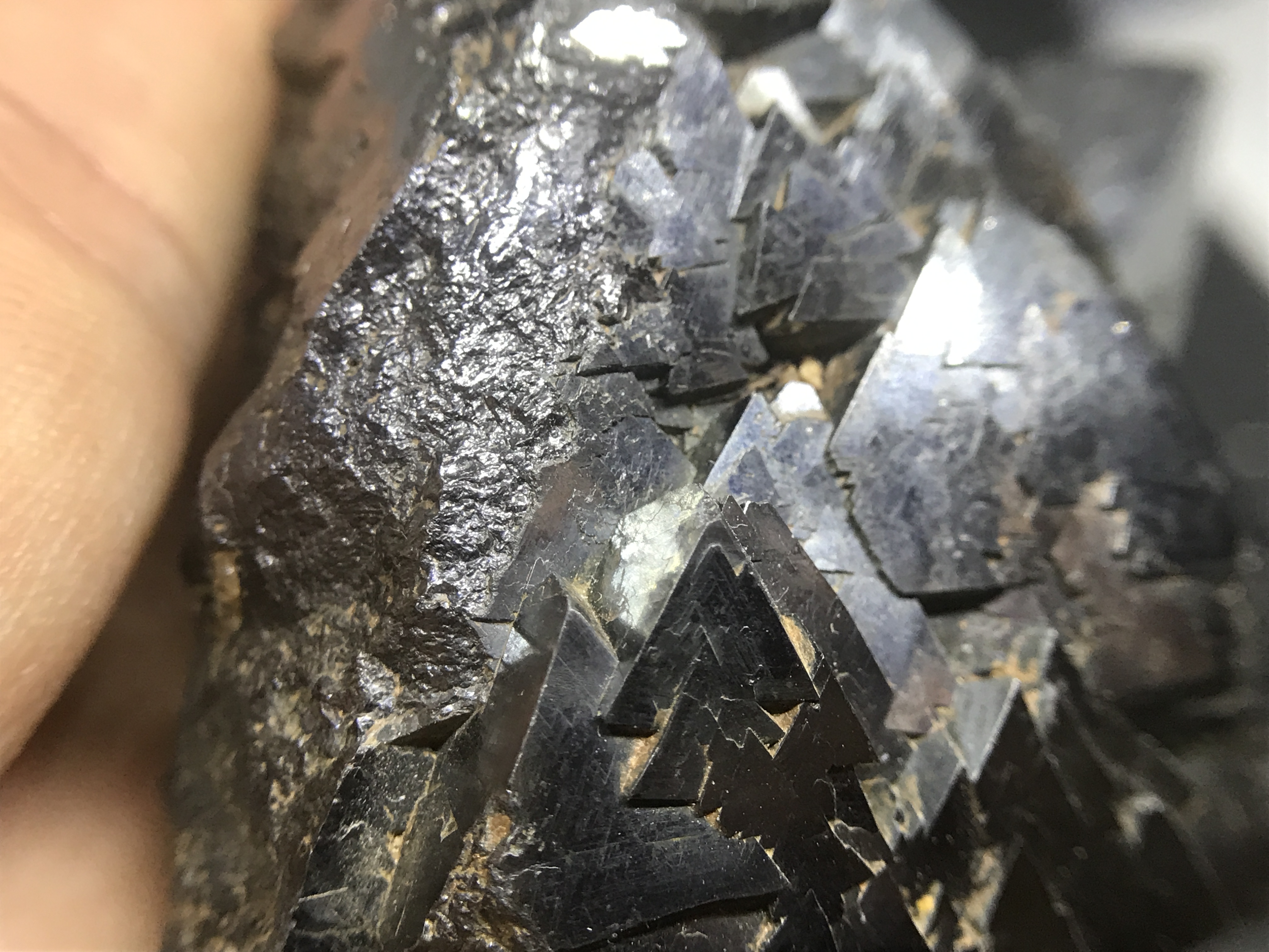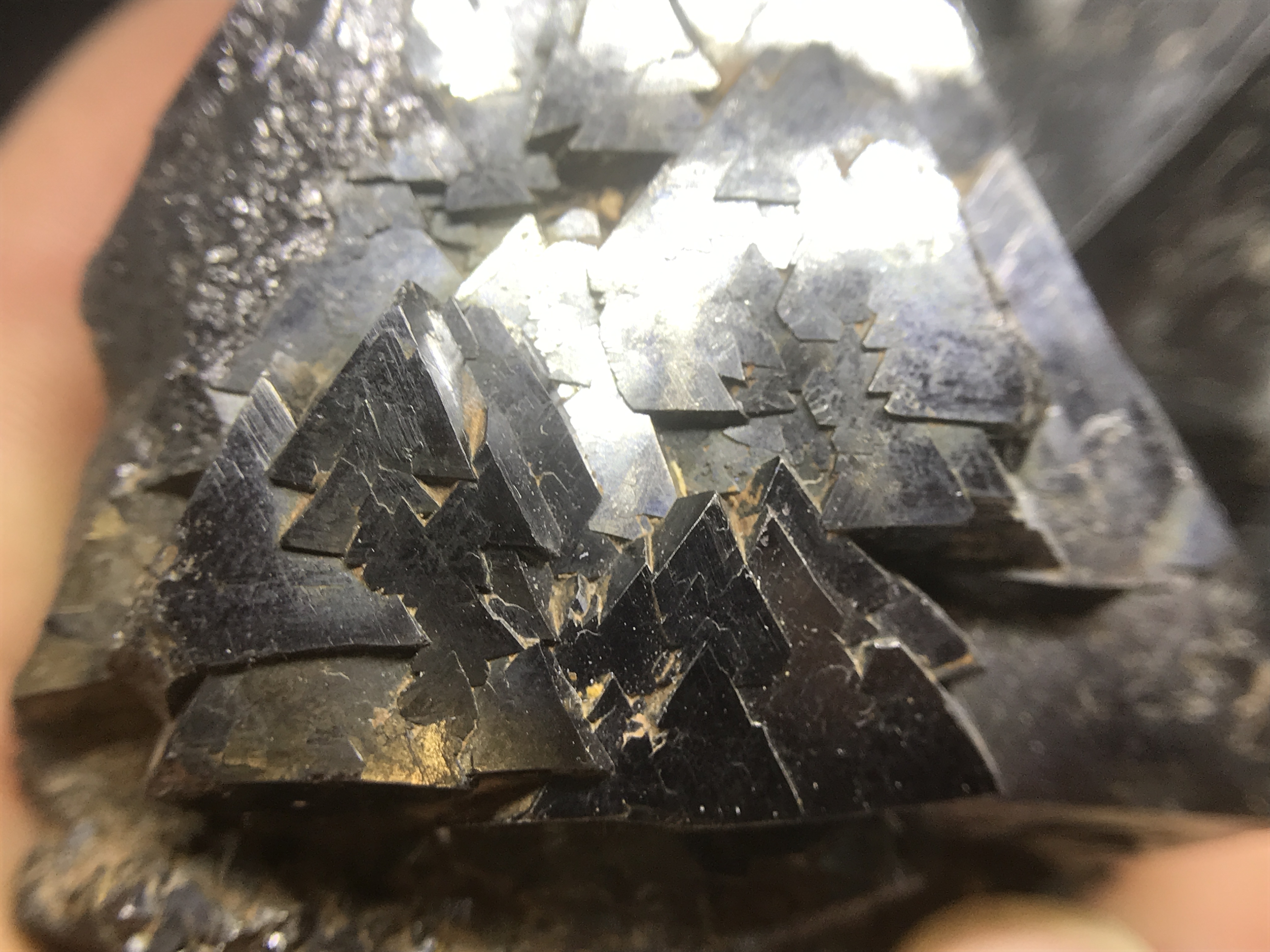 The first set are these small, but impressive. The growths form these perfect triangles one on top of the other. I've beed doing a little research, but I have yet to find how and why this magnetite forms this way.