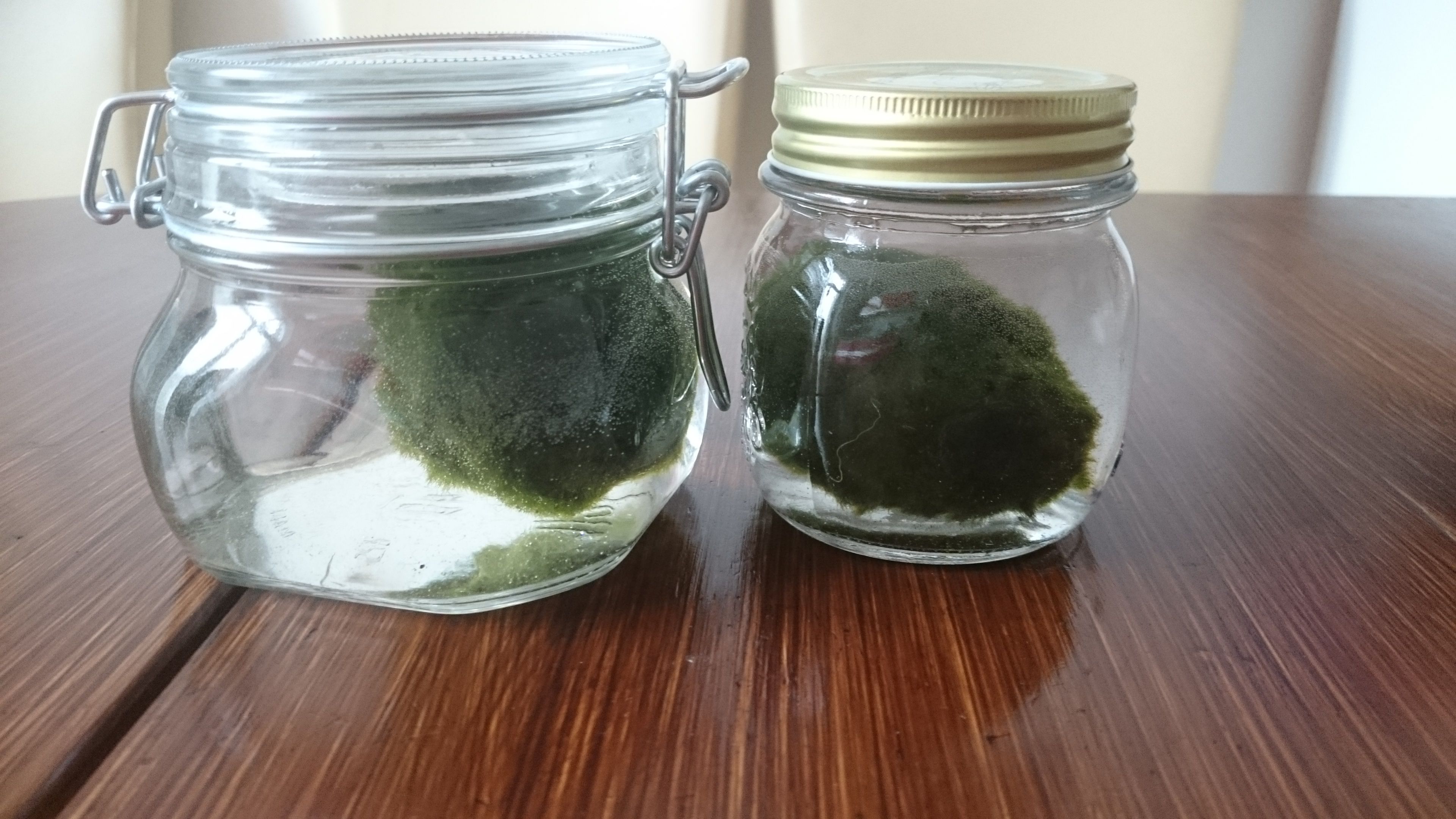 The balls grow slowly but are very easy to handle. Cold water below 25°C, no direct sunlight and maybe a bit of salt. Rinse them once in a while, replace their water once a week and they’re happy. The perfect pet for someone who isn’t responsible enough to keep an actual pet. I mean, they make their own food! They use sunlight and CO2 to feed themselves. I really just have to provide the water.