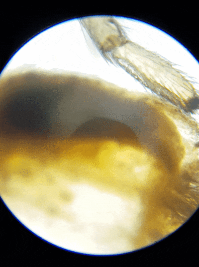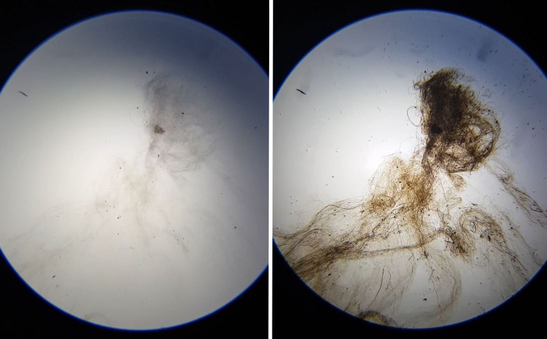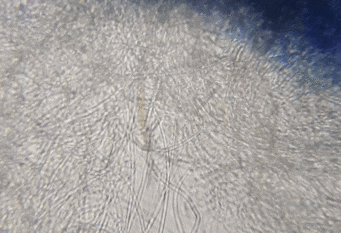 It was so soft and fine that looking at it under my microscope, there really wasnโt much to see. Here is an image of what I could see under the microscope. The right image is with the iris diaphragm closed. Doesn't the denser section look like a mini octopus with two beady eyes?
