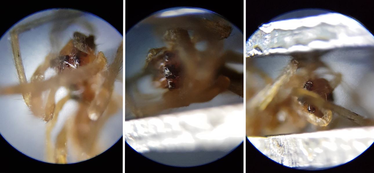 I did try very hard to obtain images of the eyes & mouth. But the spider was small to handle and the legs were shriveled up. Thus making it difficult to obtain nice images. After 13 minutes of checking out the spider and trying to position it properly using tweezers and a needle tip tool. I gave up, my hands were too shaky and I was afraid of damaging the spider. I need a pinning board to prop it in place then dry it. Anyways, here are the best images I could obtain of the eyes and mouth. Actually only the eyes.