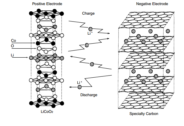 Batteries with LCO cathodes generally have graphite anodes. During charging, lithium ions move away from the cathode matrix and intercalate between the graphite layers. The ions move back towards the LCO during discharge.