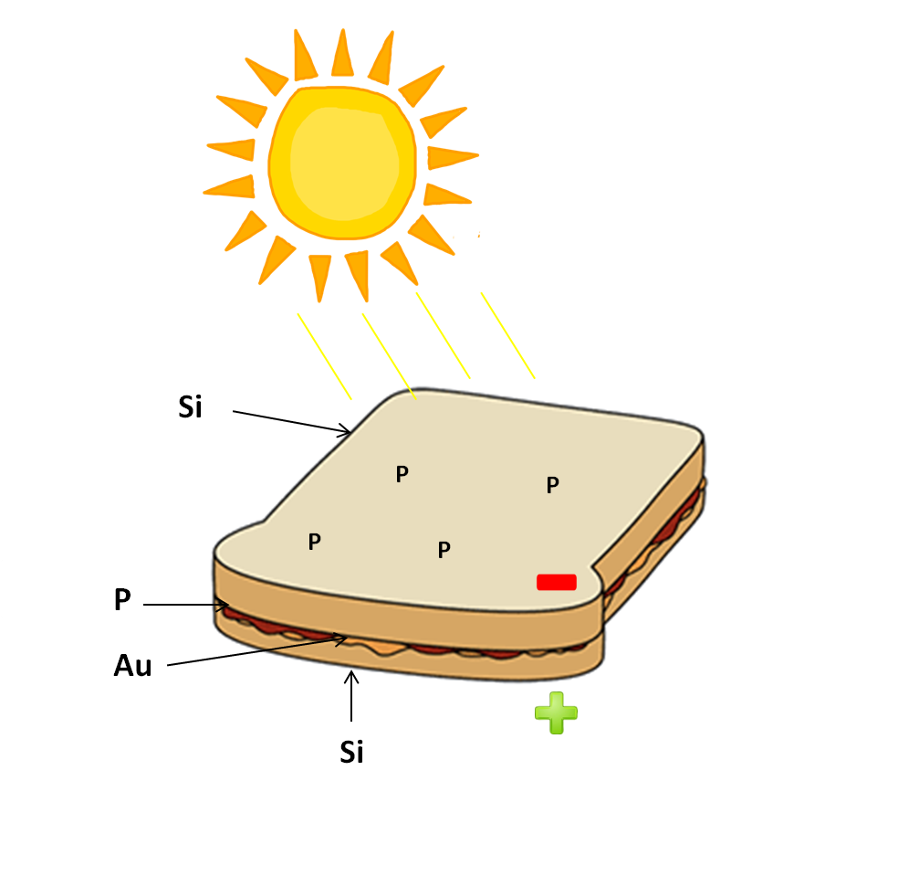 Ahora, como la imagen de arriba es un poco aburrida, intentaré explicar de otra forma: Imaginen un sandwich sin relleno cuyo pan es de Silicio. Aunque sin relleno, ambas tajadas de pan tienen diferente sabor; la tajada de Silicio que da al sol (capa n) debe tener incrustaciones de un material cuyos átomos tengan más electrones que el silicio (como el fósforo) y de igual forma la otra capa (capa p), de un material cuyos átomos posean menos electrones que el silicio (como el oro o boro), de forma que cuando los fotones irradien a la capa n rompan enlaces y obliguen a los electrones a moverse a la capa p, permitiendo así un flujo de corriente eléctrica.