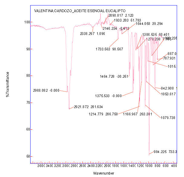 As a result we obtained an oil of acceptable quality according to density and refractive index. The IR spectrum allowed to determine that the oil was not contaminated since only are seen peaks related to compounds that were expected to be found in the oil. The yield however was only 0.1%, so we conclude that the particle size was the determining factor, as I had already mentioned.