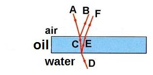 En realidad es Óptica, como Batman lo dice sabiamente (Pueden revisar este post para entender los fenómenos de descomposición (difracción) y reflexión). El asfalto está hecho a base de hidrocarburos, agua y otros materiales, lo que forma capas de petróleo con aire y petróleo con agua. Como pueden ver en la siguiente imagen, la luz del rayo atraviesa la primera capa (A), parte de esta luz se refleja (B) y la otra parte, que se difracta (C), es la que permite ver los colores así como en el anterior post el Prisma de Newton. Esta luz difractada se refleja de nuevo en la otra capa (E) y se difracta de nuevo (D). La parte F es una difracción del rayo E.