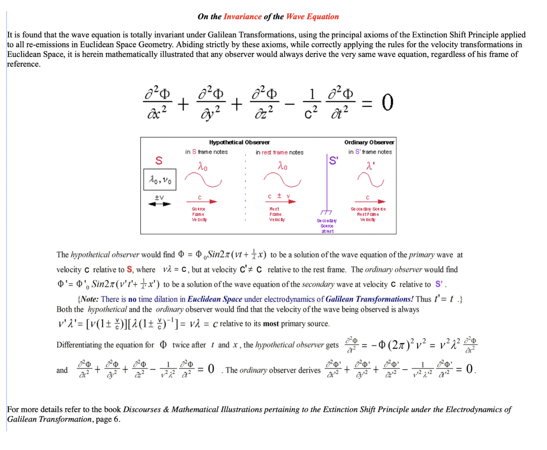 Φ = ΦₒSin2π (νt + 1/λ x) to be a solution of the wave equation of the PRIMARY wave at velocity c relative to S, where νλ = c, but at velocity c'≠ c relative to the rest frame.