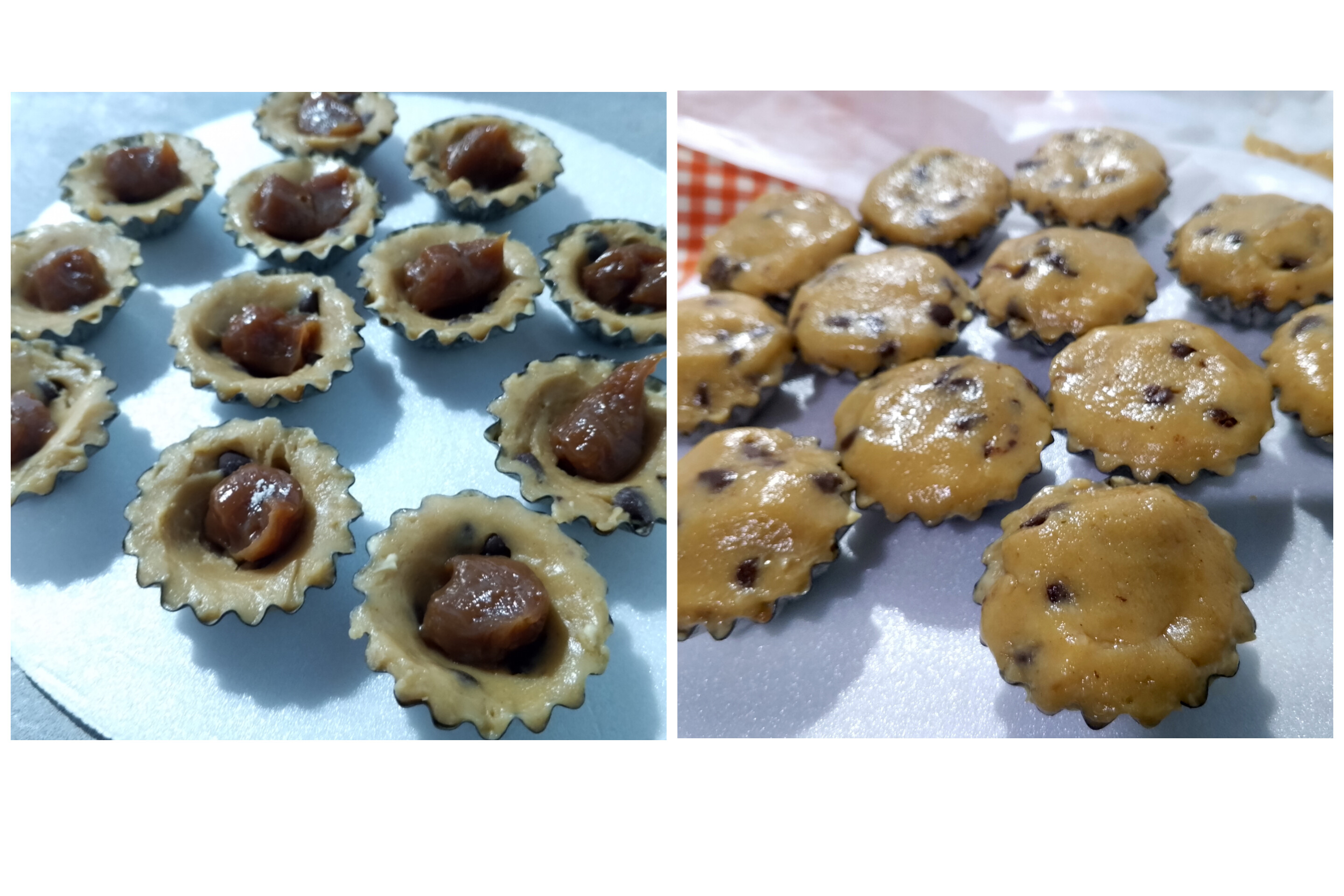 También estire en papel encerado una porción de masa y lleve todo esto al congelador nuevamente por 1 hora. Pasado este tiempo, agregue arequipe en el centro de cada molde, también enharine un cortador redondo y fui sacando cada tapita para sellar cada cookie cups.