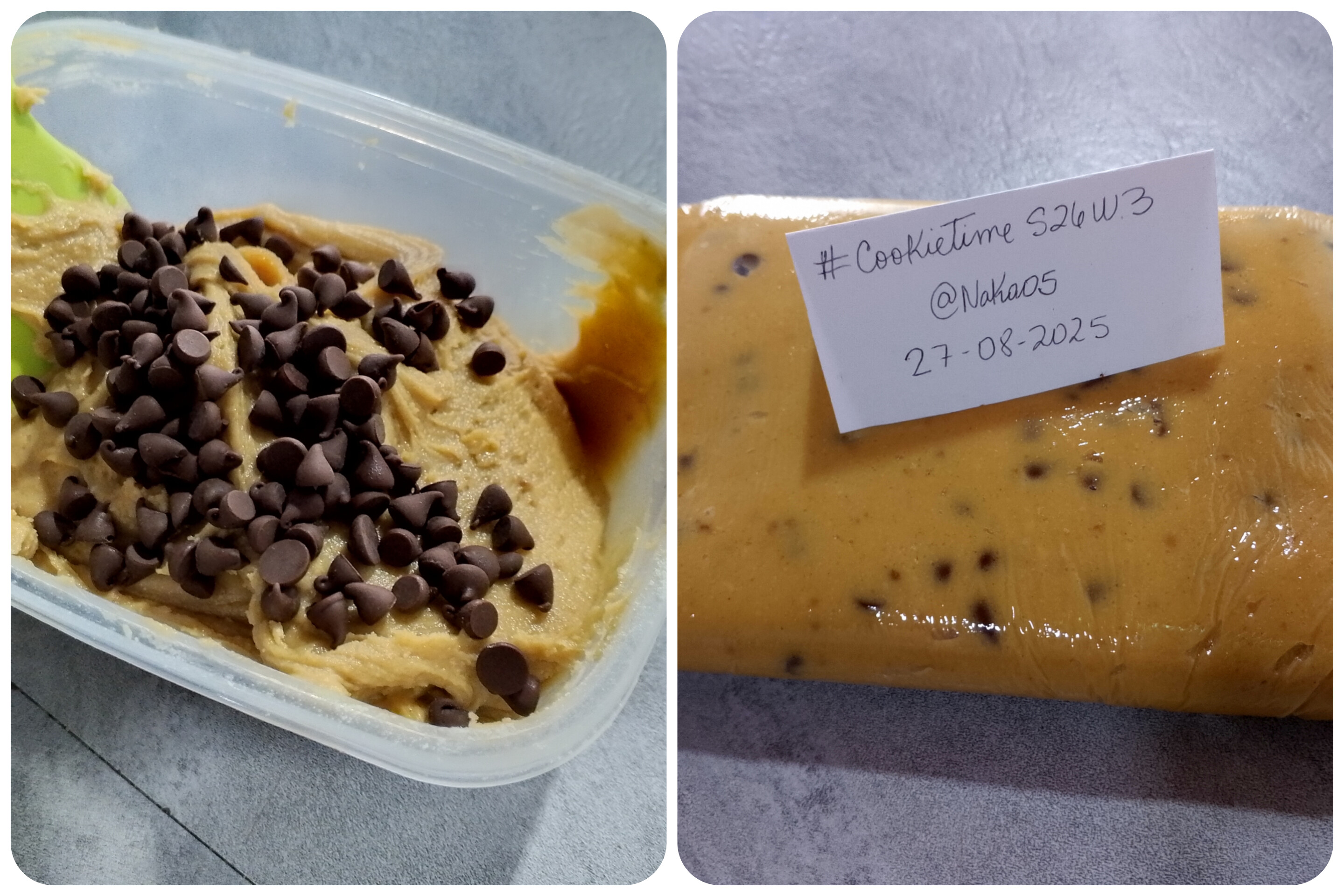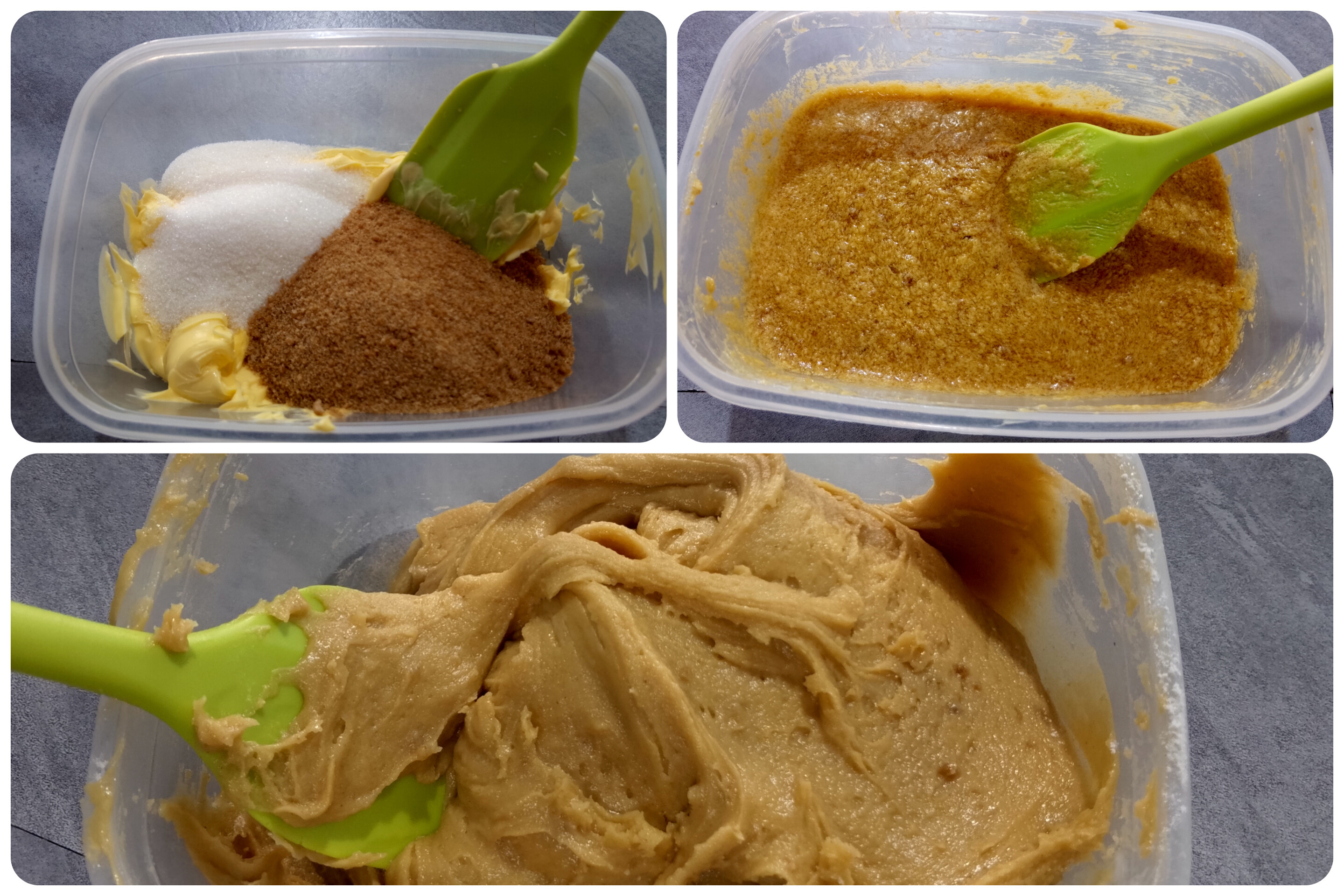En otro envase, agregar la mantequilla, azúcar refinada y azúcar morena, integrar. Seguidamente agregue el huevo y la esencia de vainilla, integre y fui agregando la harina de trigo que tenía reservada hasta integrarla por completo