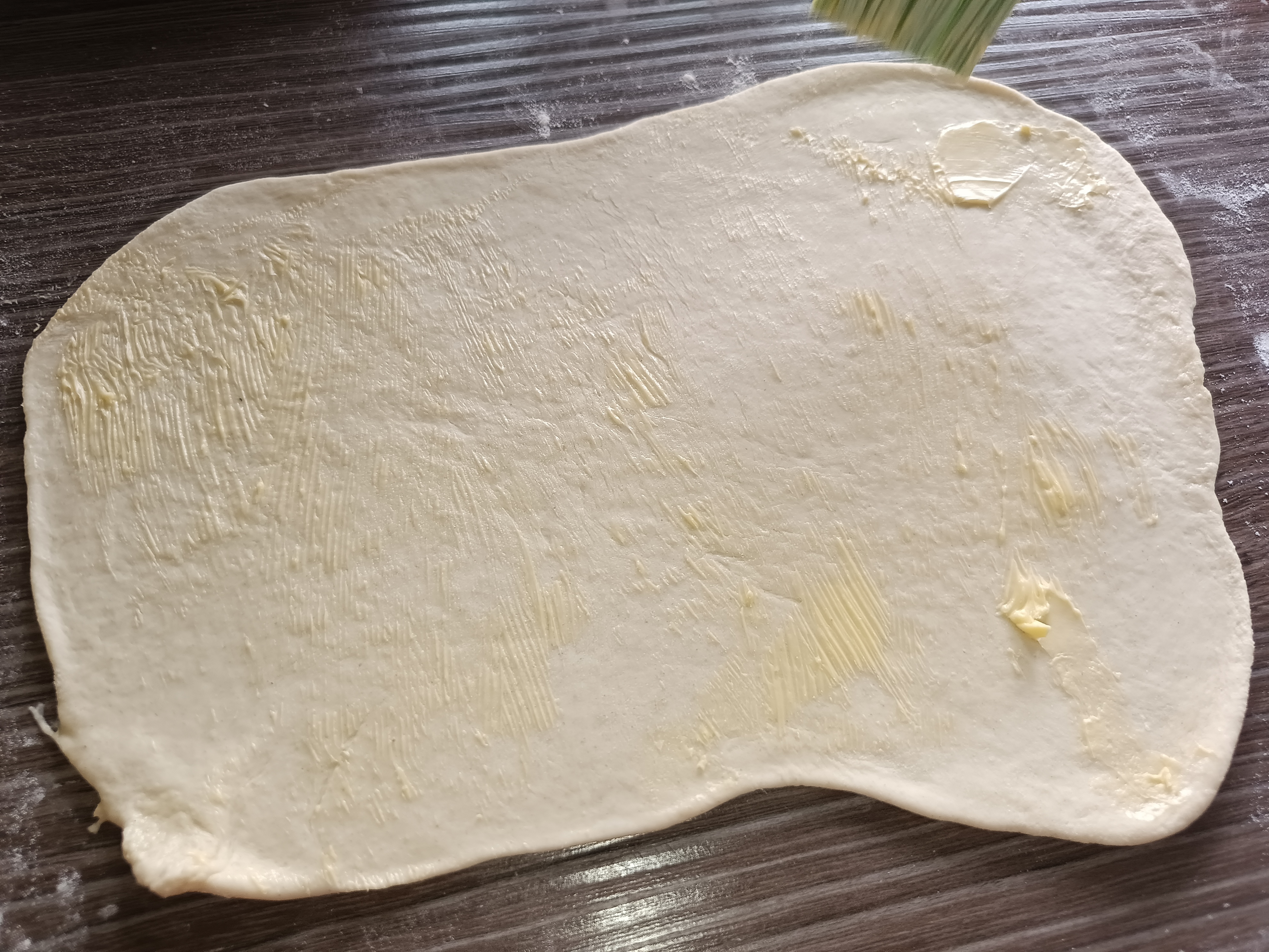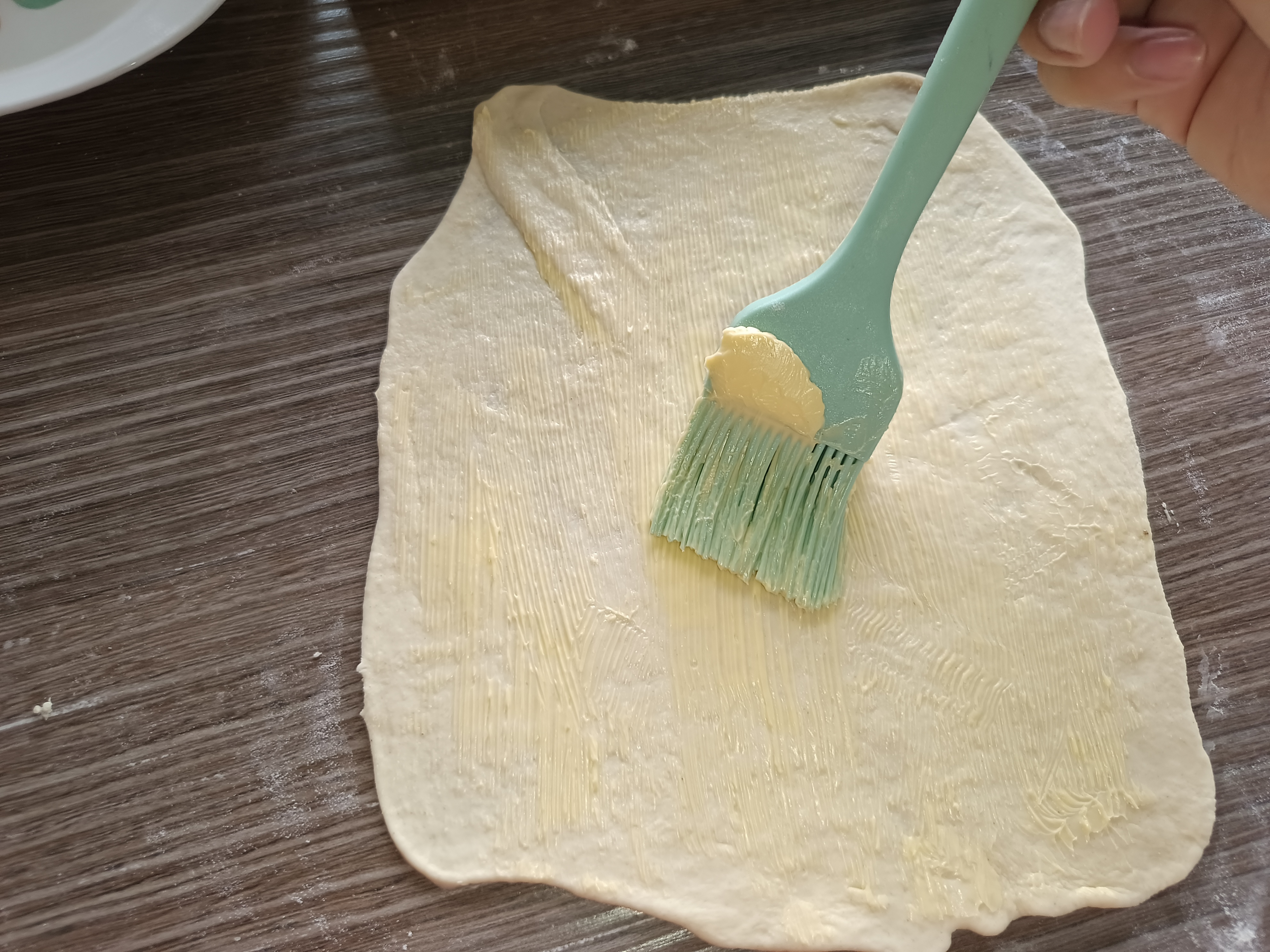 Por supuesto que también probé con el estilo paratha circular, el procedimiento es básicamente el mismo estirar muy bien la masa agregar mantequilla y doblar en esta oportunidad hacer como una especie de tira larga, que luego vamos a enrollar como si fuera un caracol.