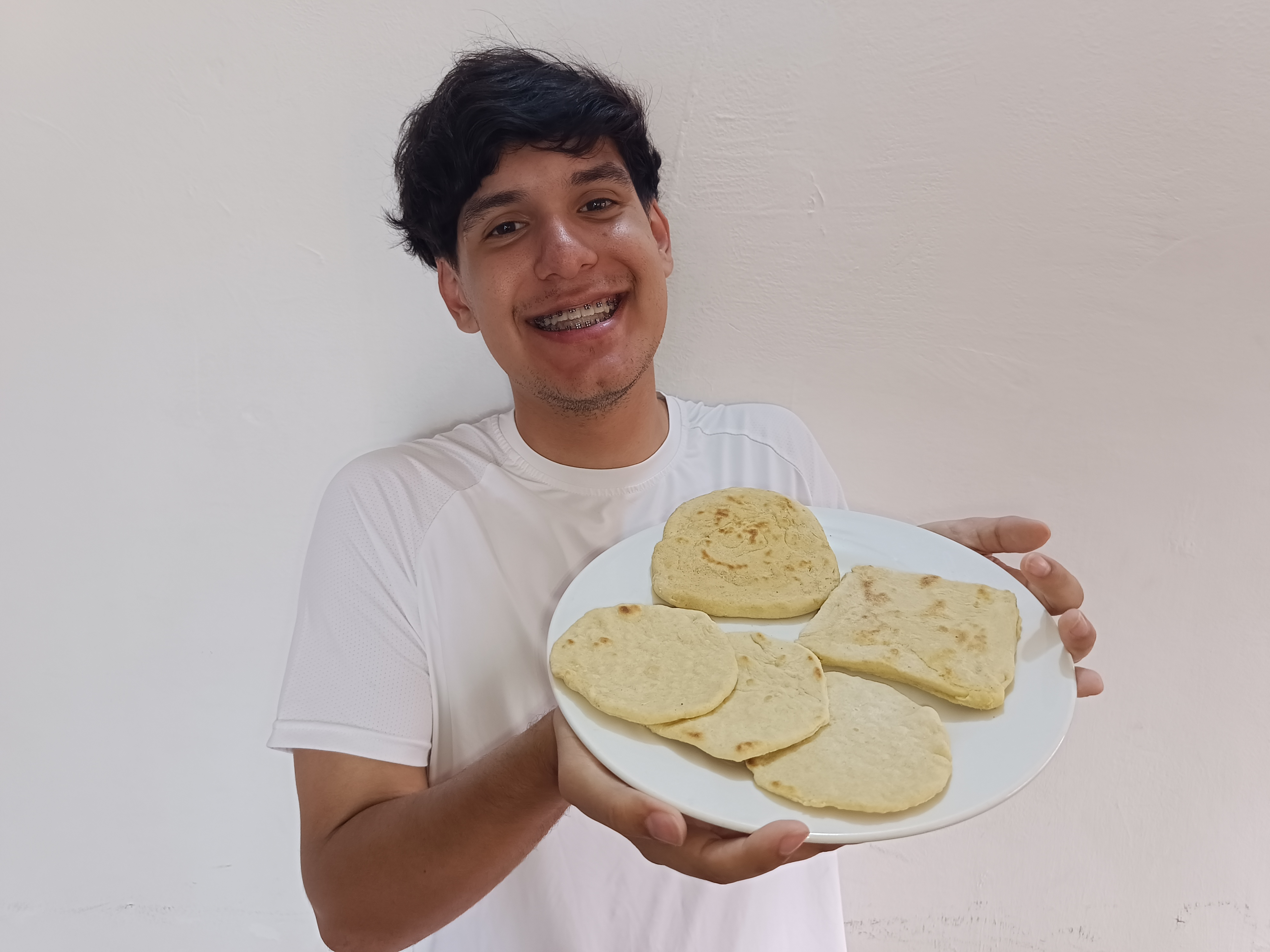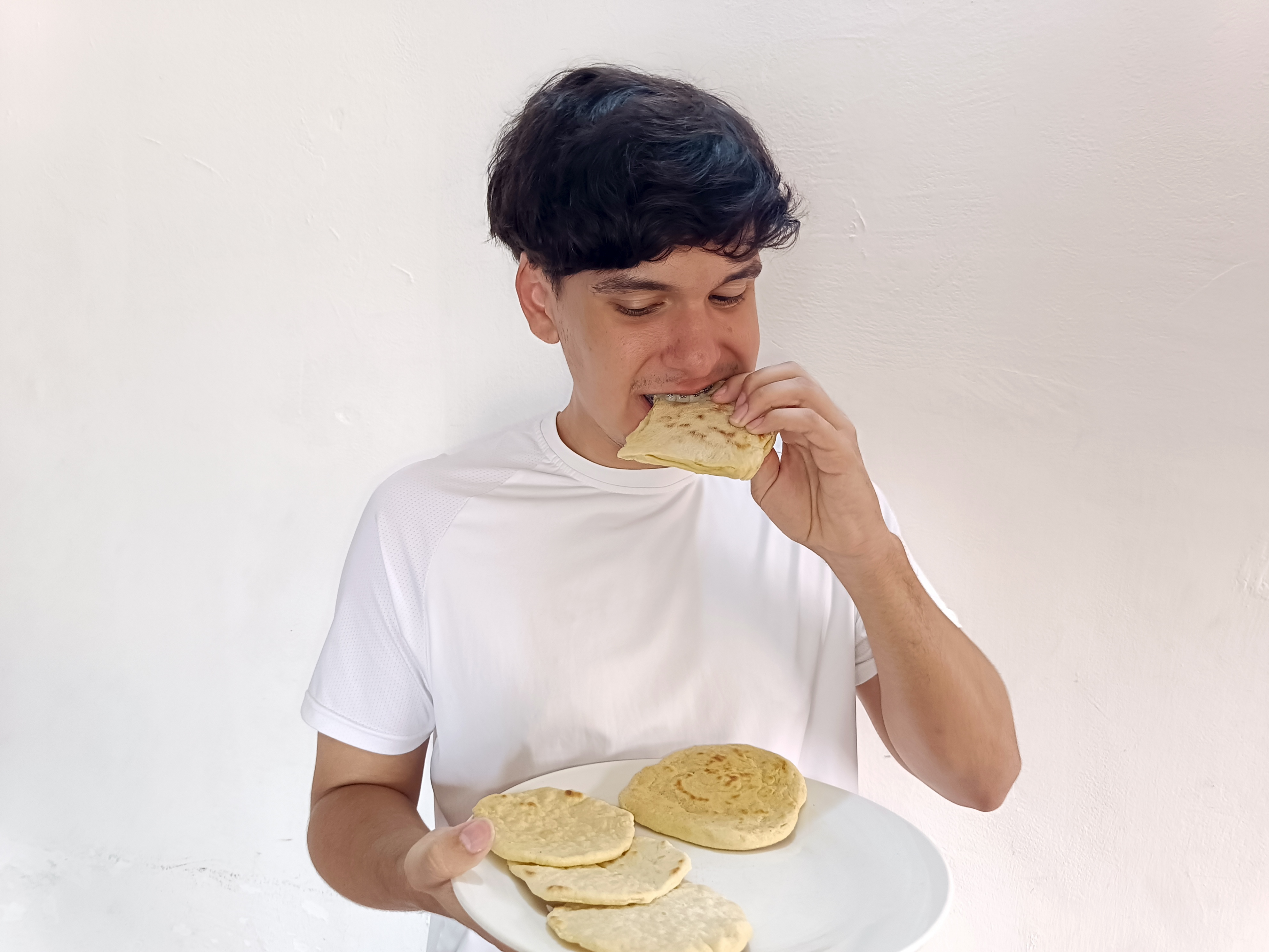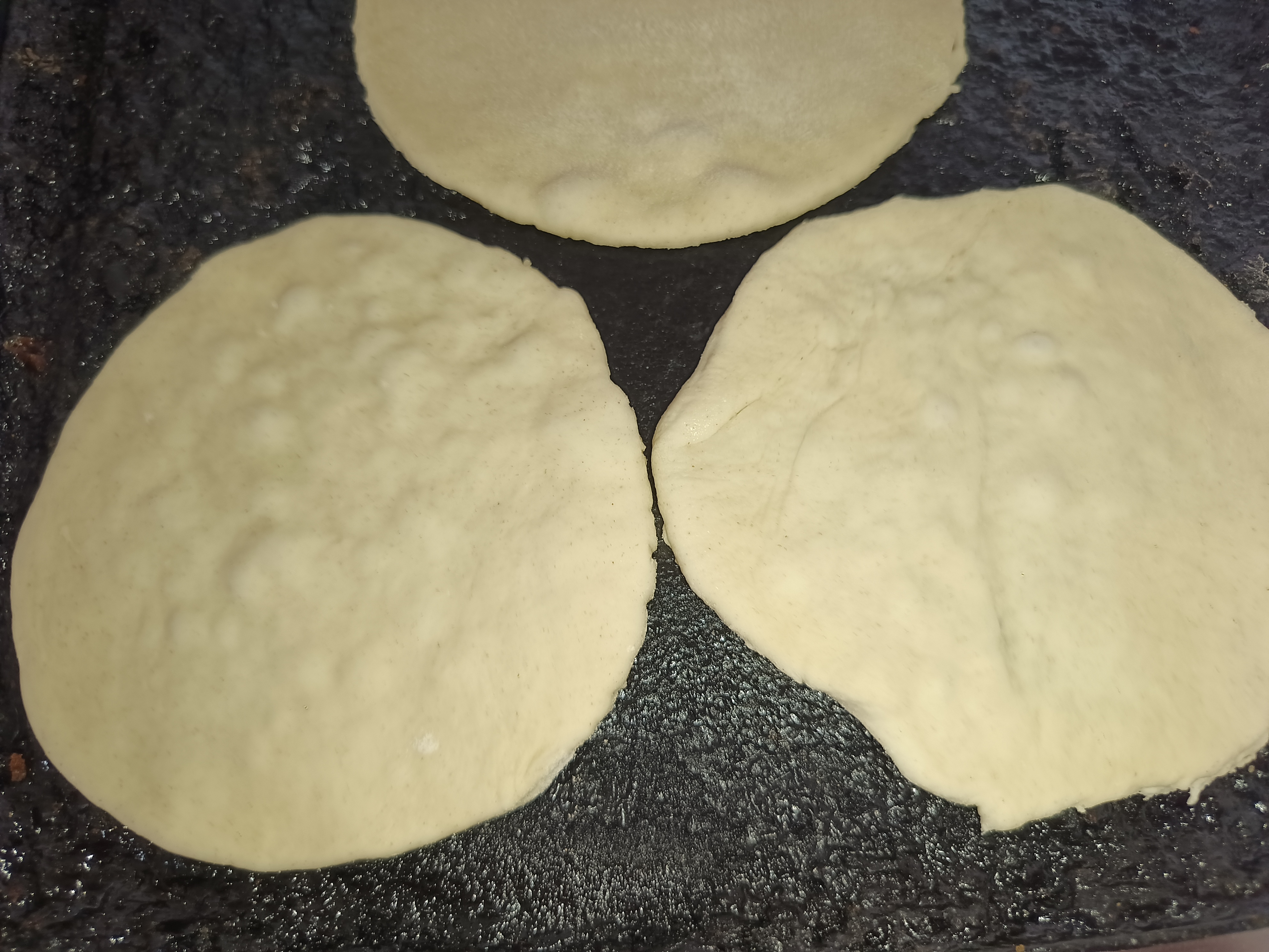 Una vez nuestro pan esté listo y tenga la forma que deseamos lo vamos a llevar a una plancha caliente para dejar cocinar por ambos lados, notaremos que empieza a hacer burbujas sobre el pan, doramos por ambos lados y retiramos.