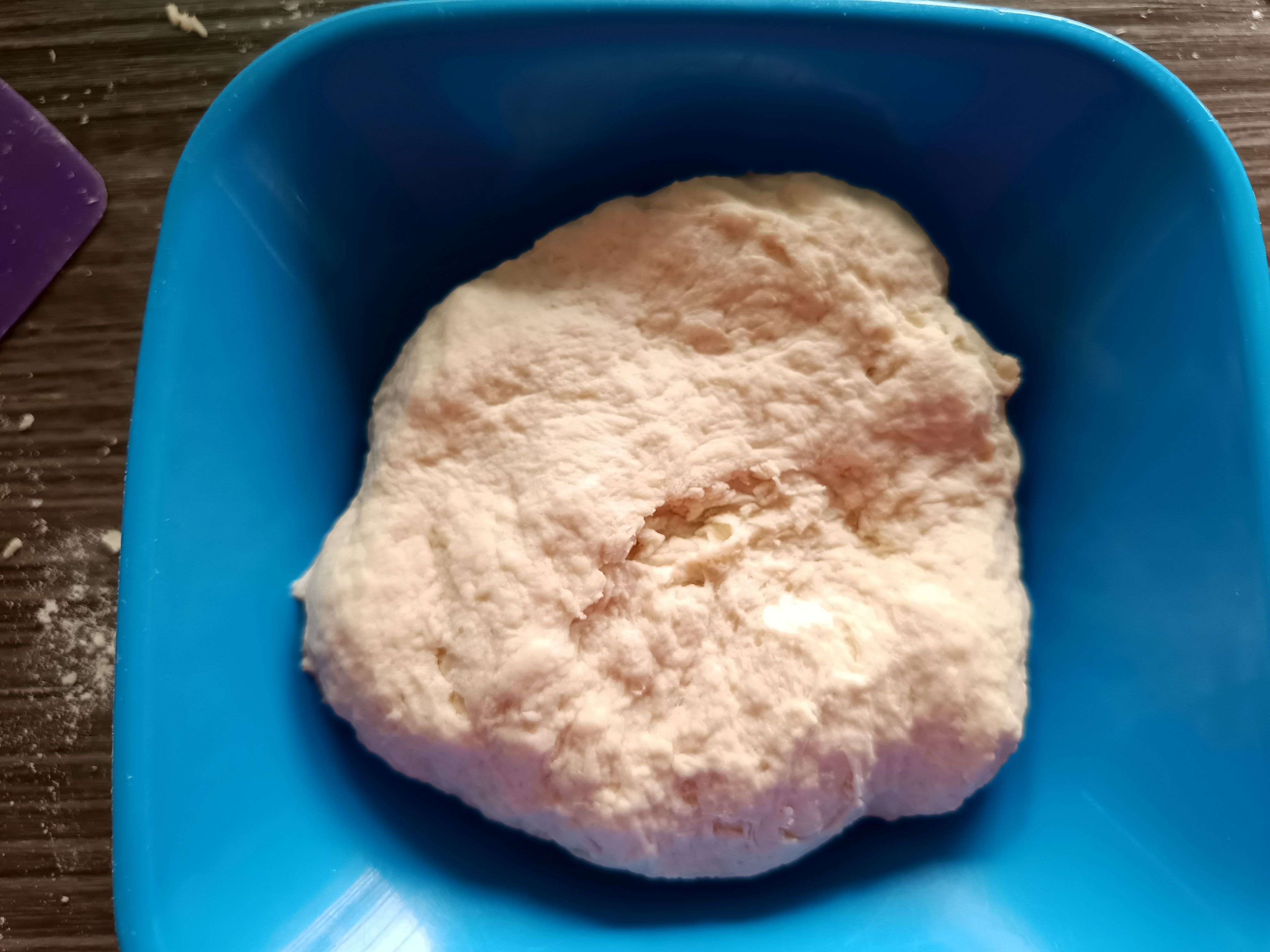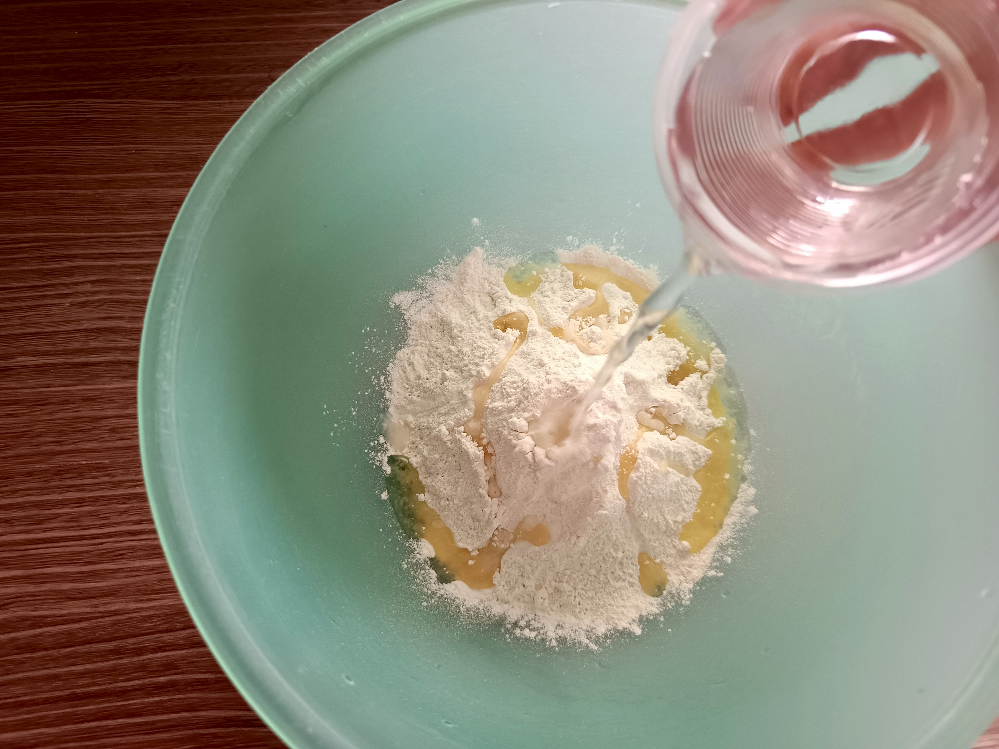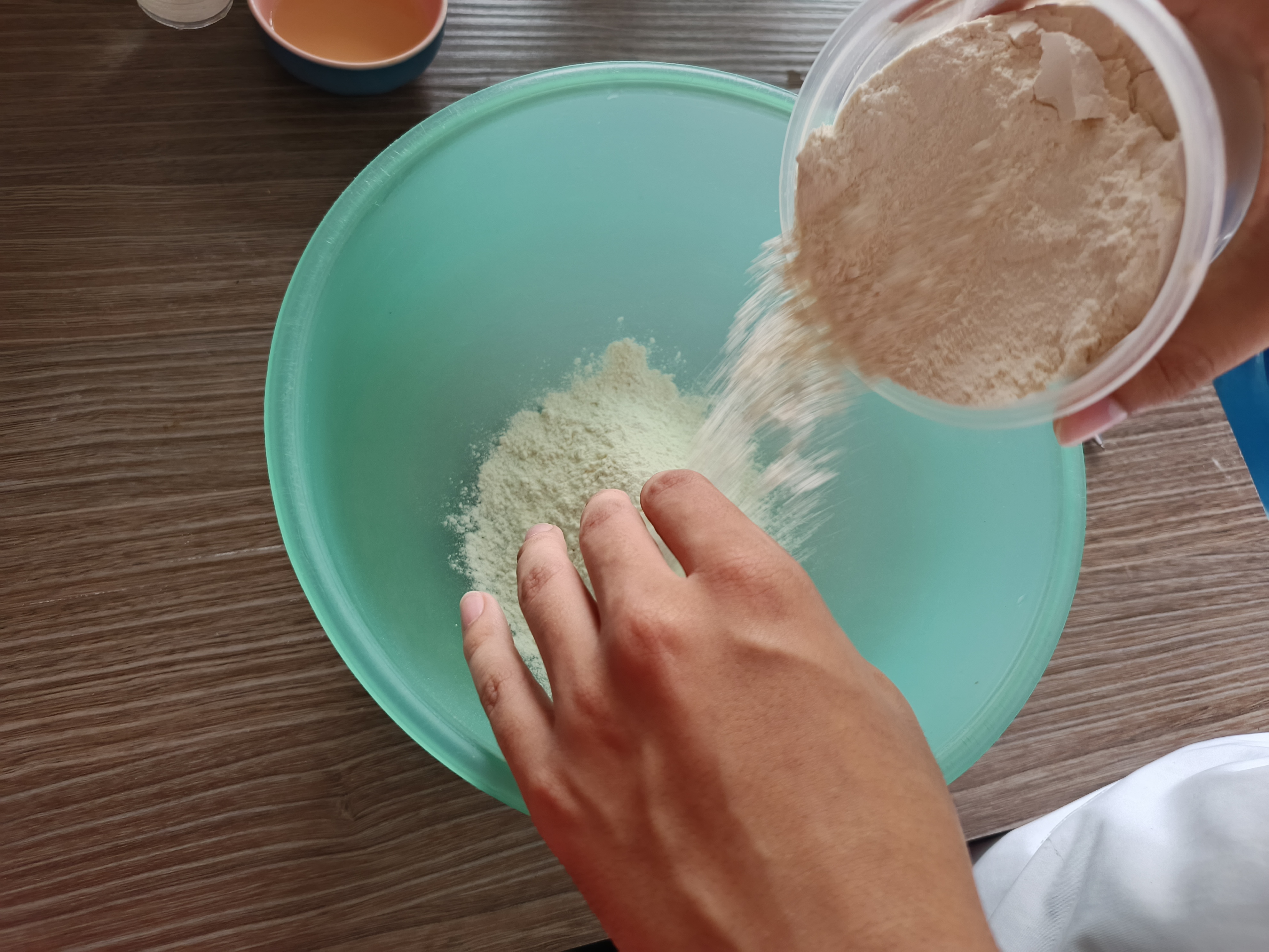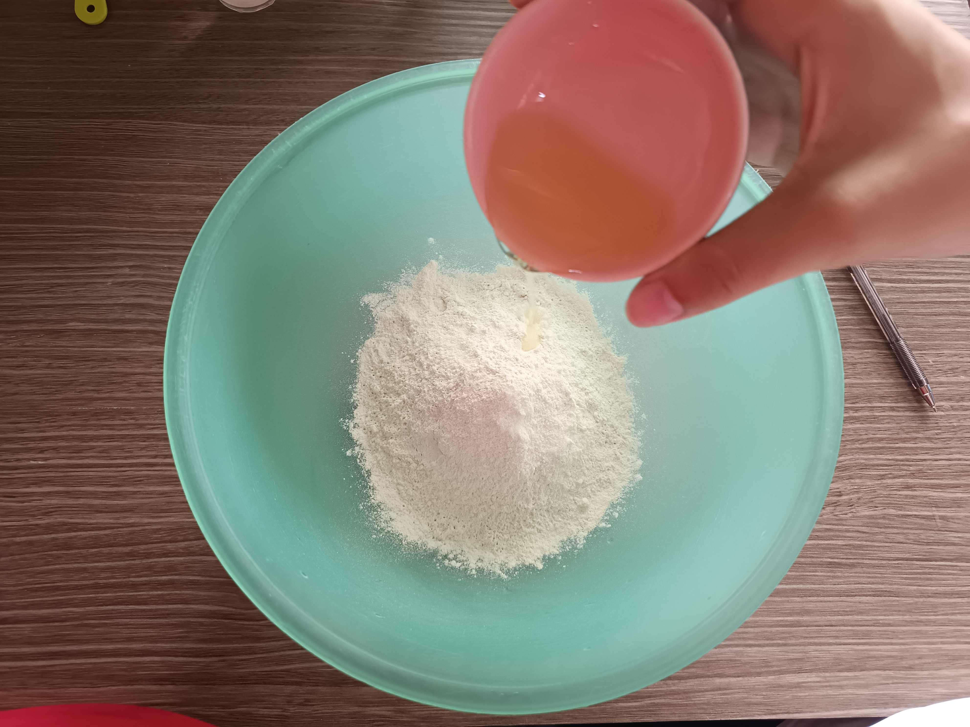 Paso 1_. En un bol agregué la harina, para empezar mezclar todos los ingredientes, después de la harina ponemos la sal, el aceite y luego el agua poco a poco y empezamos a mezclar con la mano.