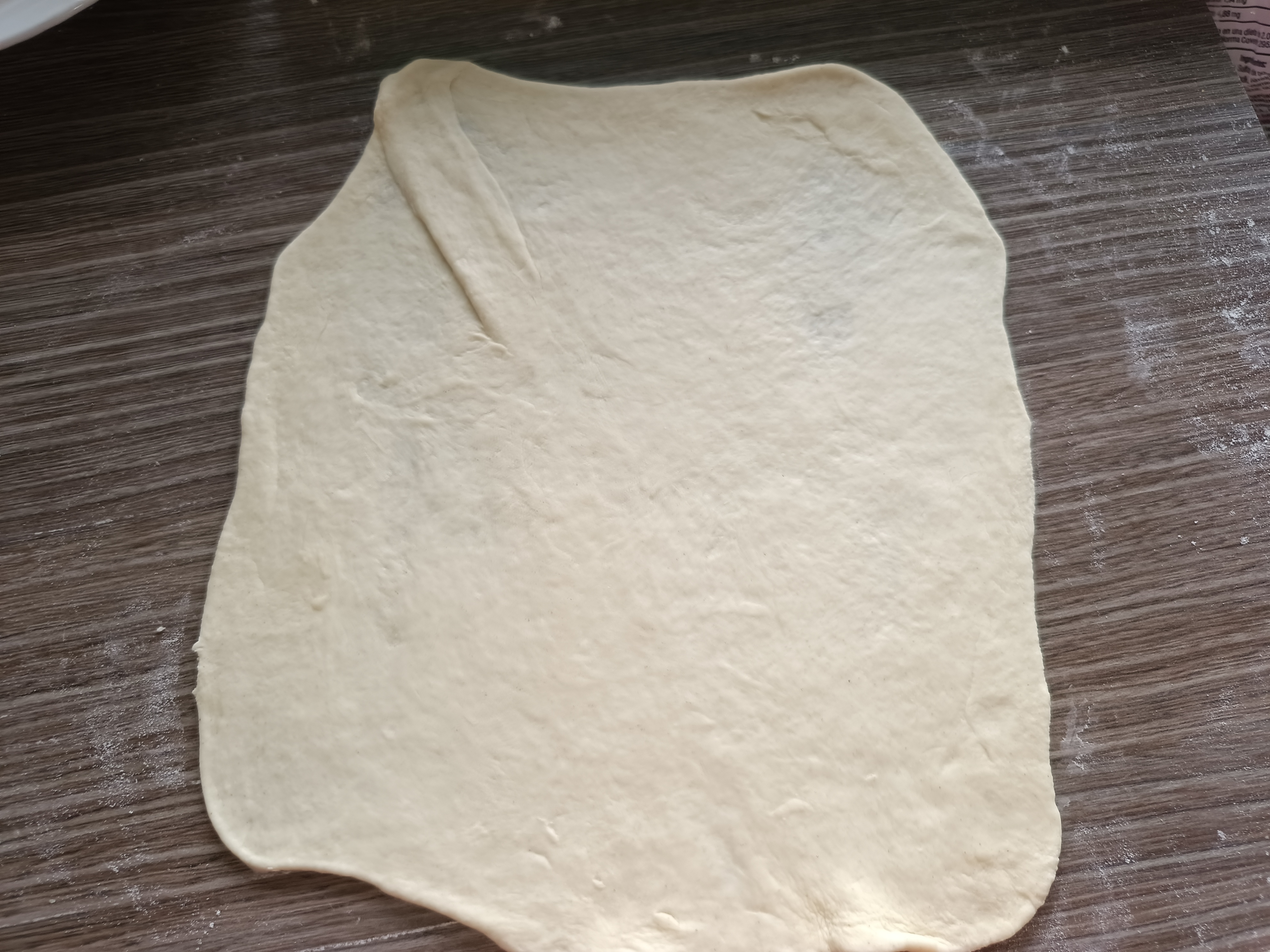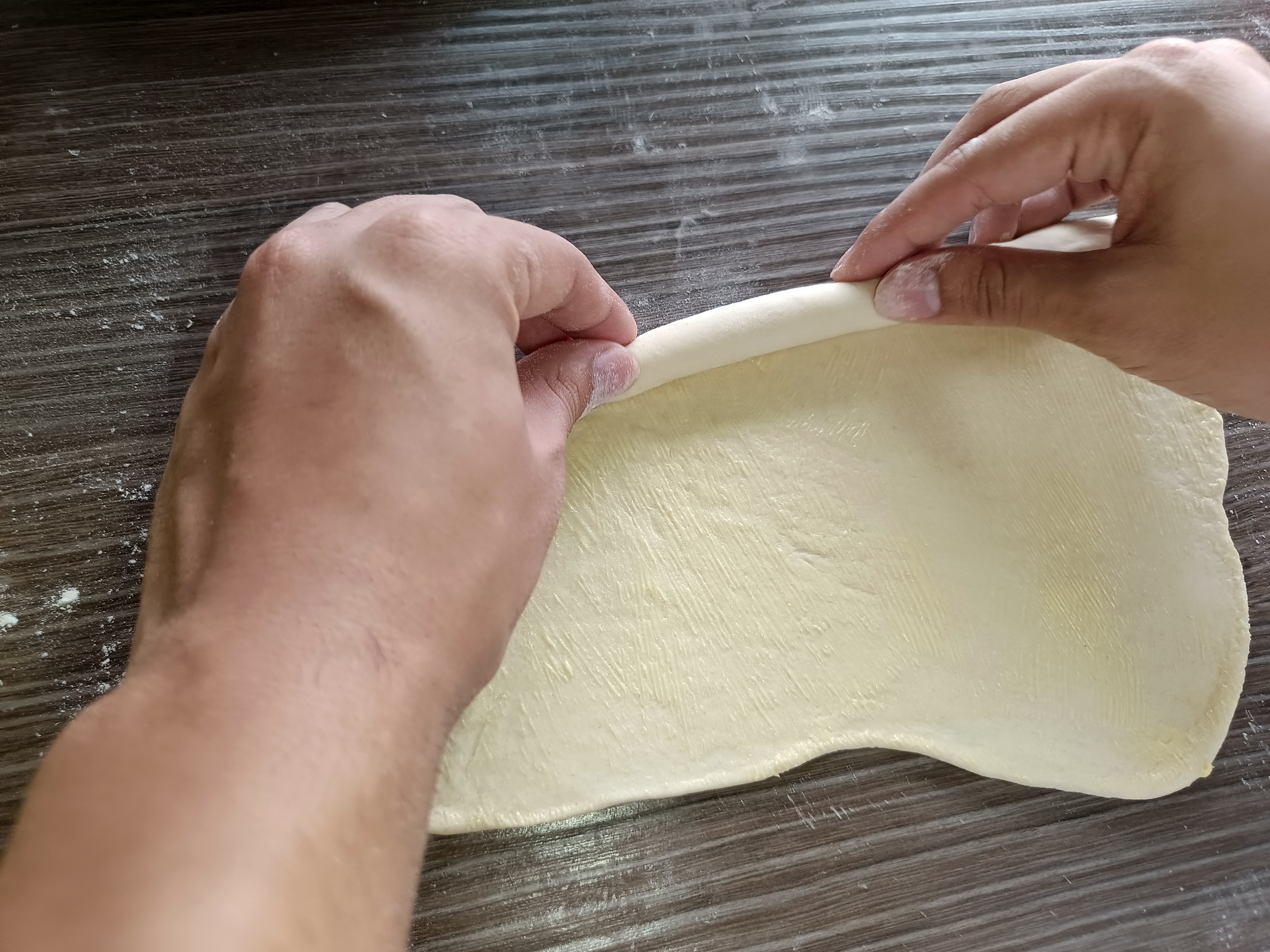 Luego hacemos lo mismo que con el cuadrado vamos a estirar bastante para que quede delgadito, y lo vamos a llevar a cocinar y untamos mantequilla encima, hasta que esté listo.