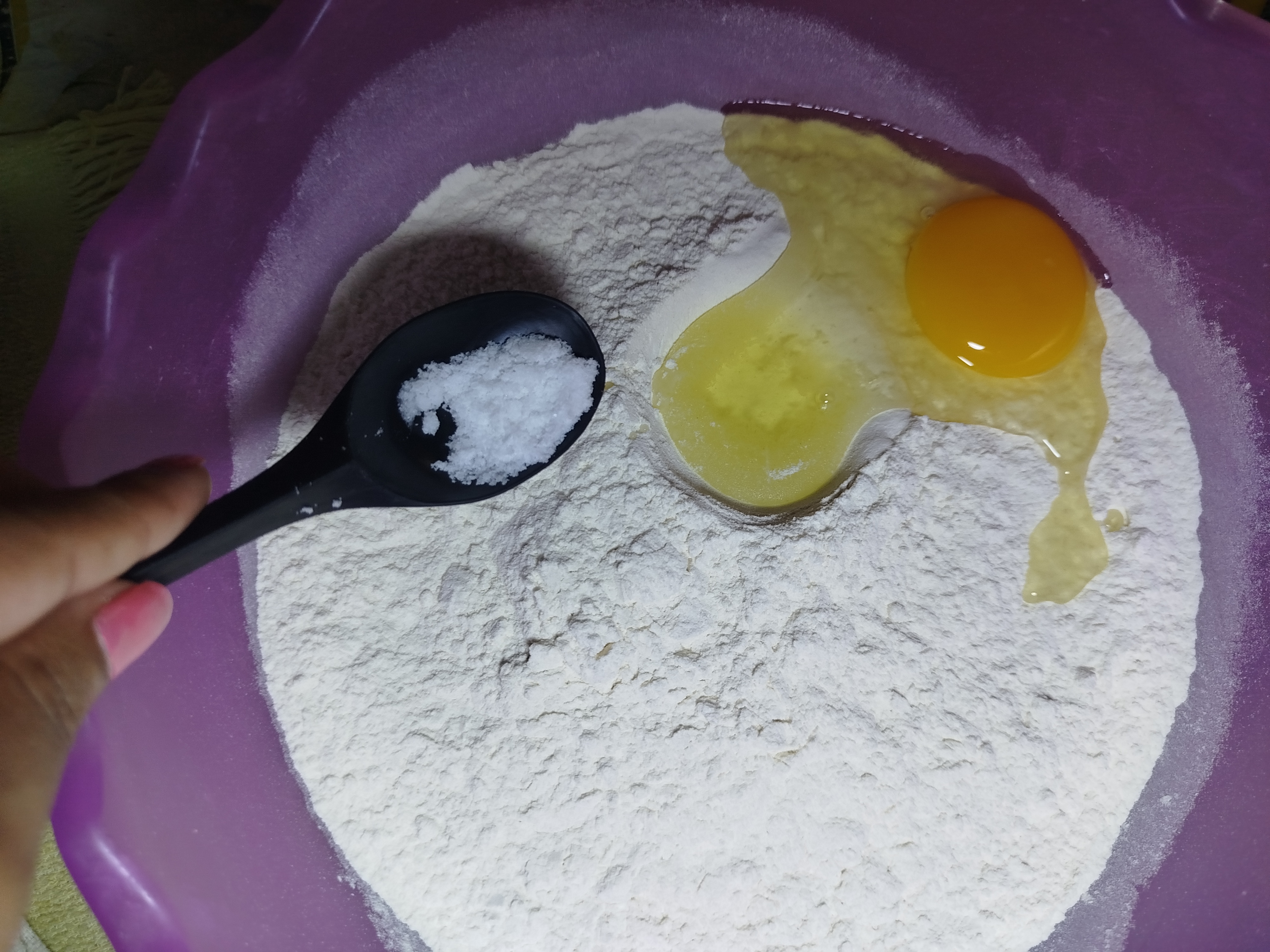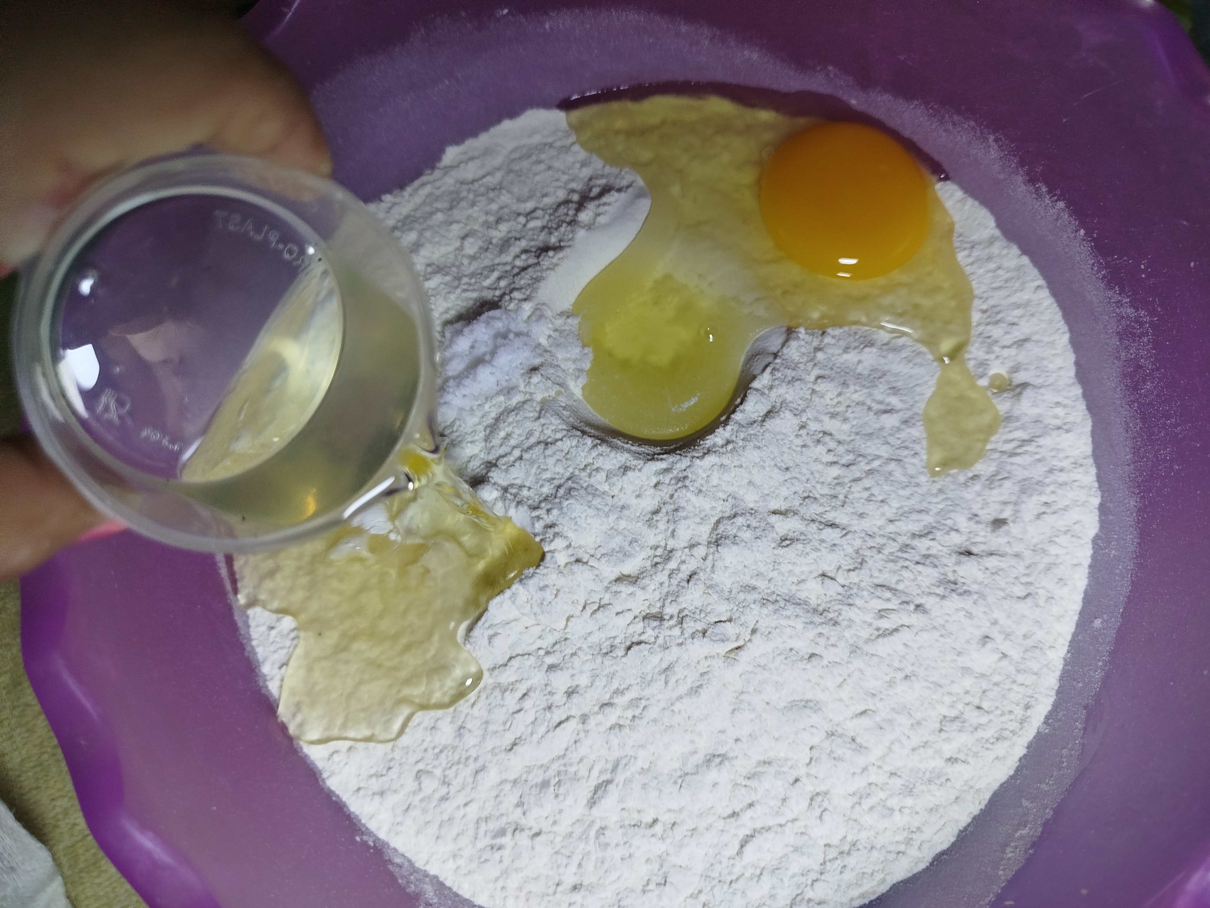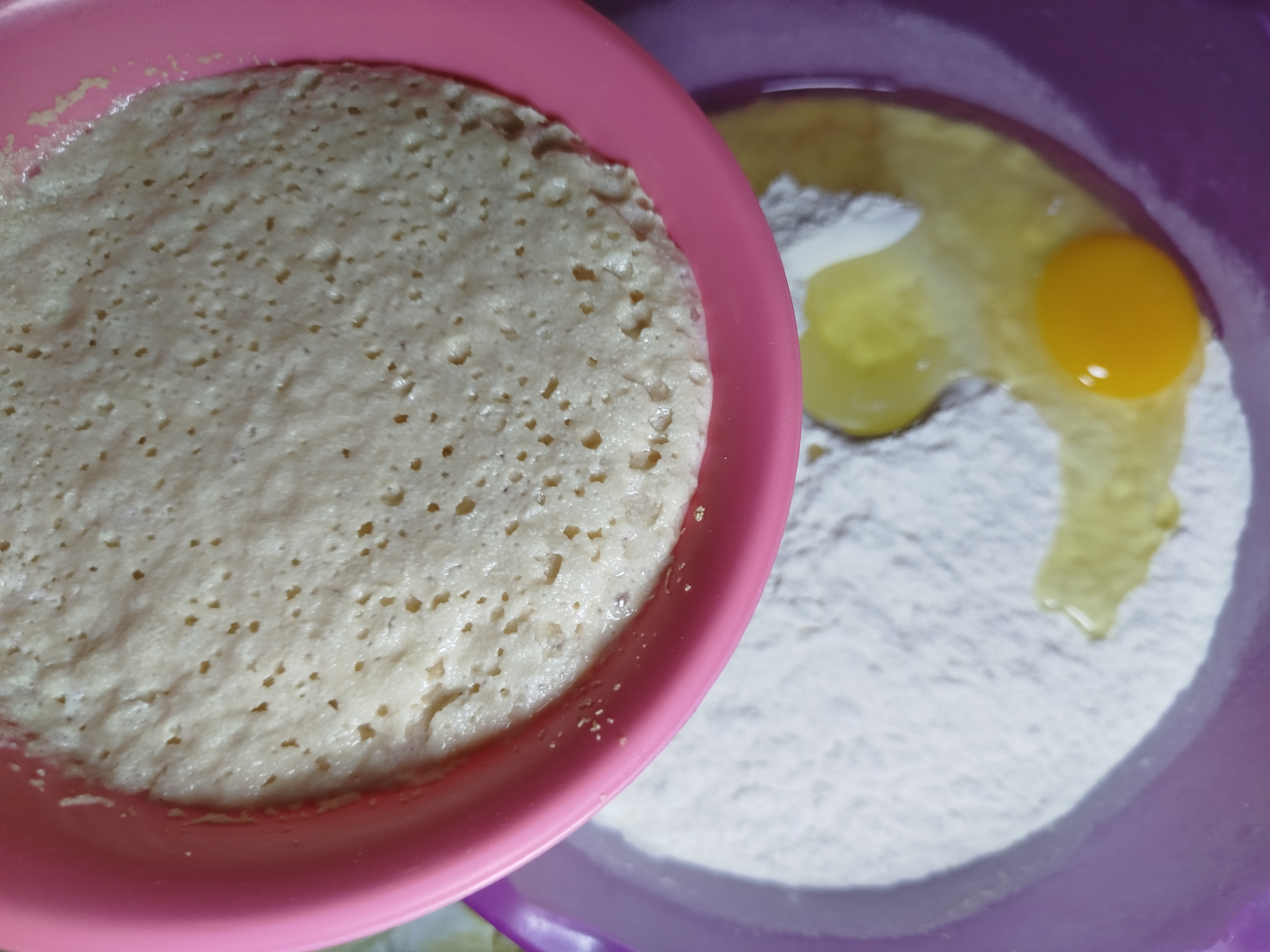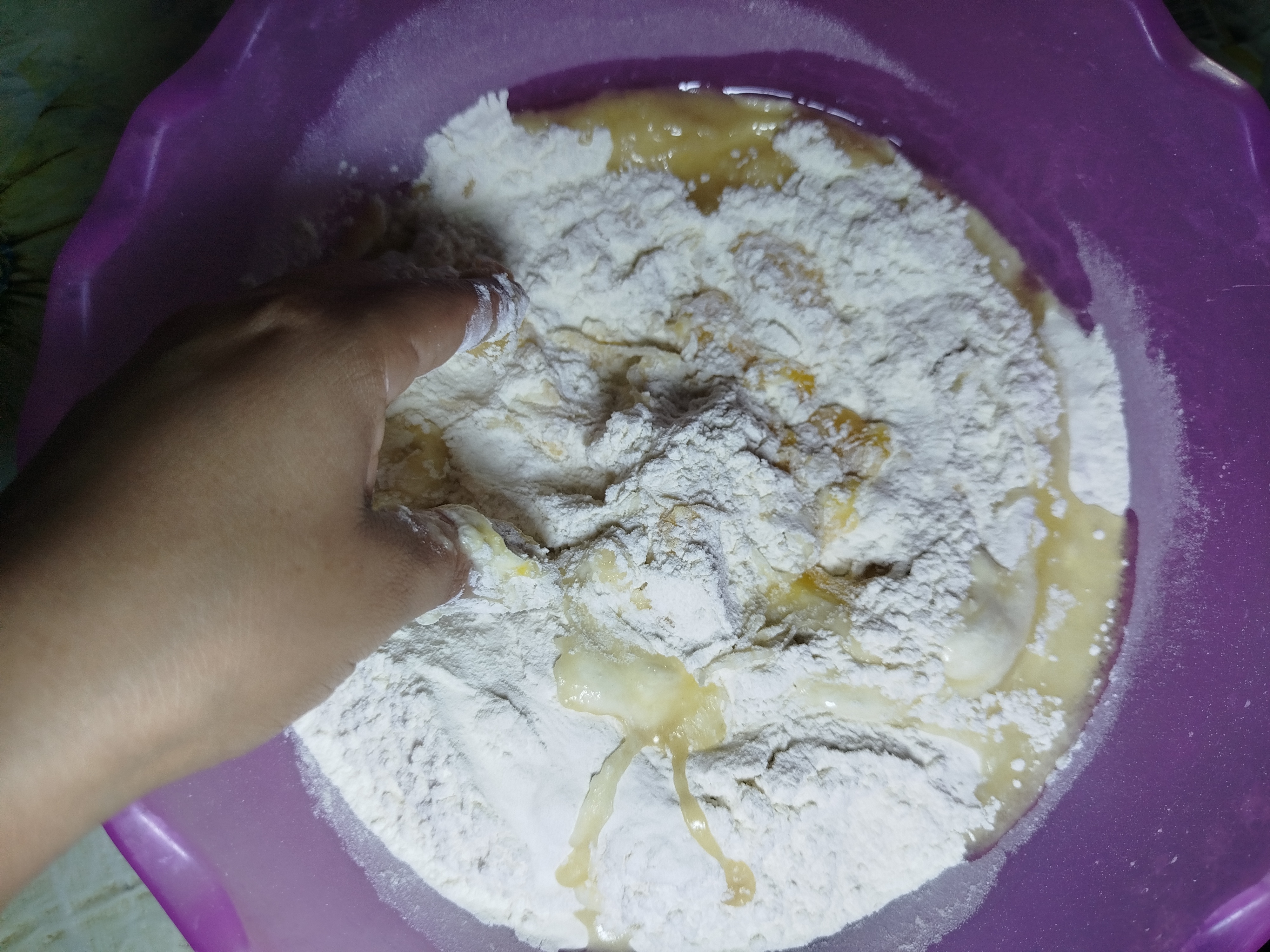 Después un bol mas grande colocamos la harina de trigo y vamos añadiendo los siguientes ingredientes, primero añadimos los huevos y nos cercioramos de que este en buenas condiciones, después añadimos la sal, seguido el aceite y finalmente la levadura activada, bien ahora que tenemos todos los ingredientes debemos unirlos muy bien para que se integren.