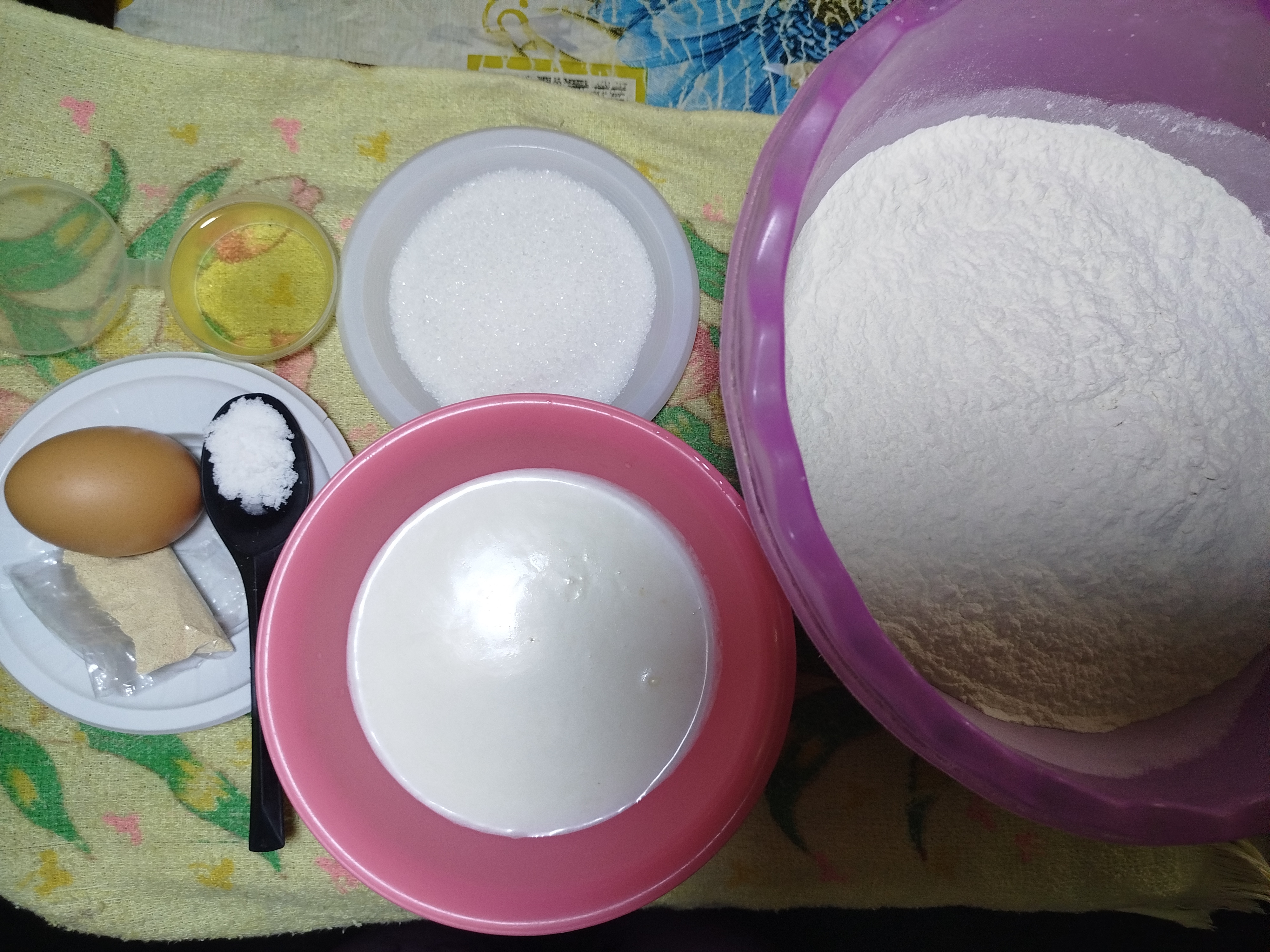 Los ingredientes utilizados son: harina multiusos 800gr, Levadura 14 gr, leche caliente 2/ tazas, Sal 1 cucharadita, Azúcar 2 cucharada, Aceite 100ml, Huevo 2.