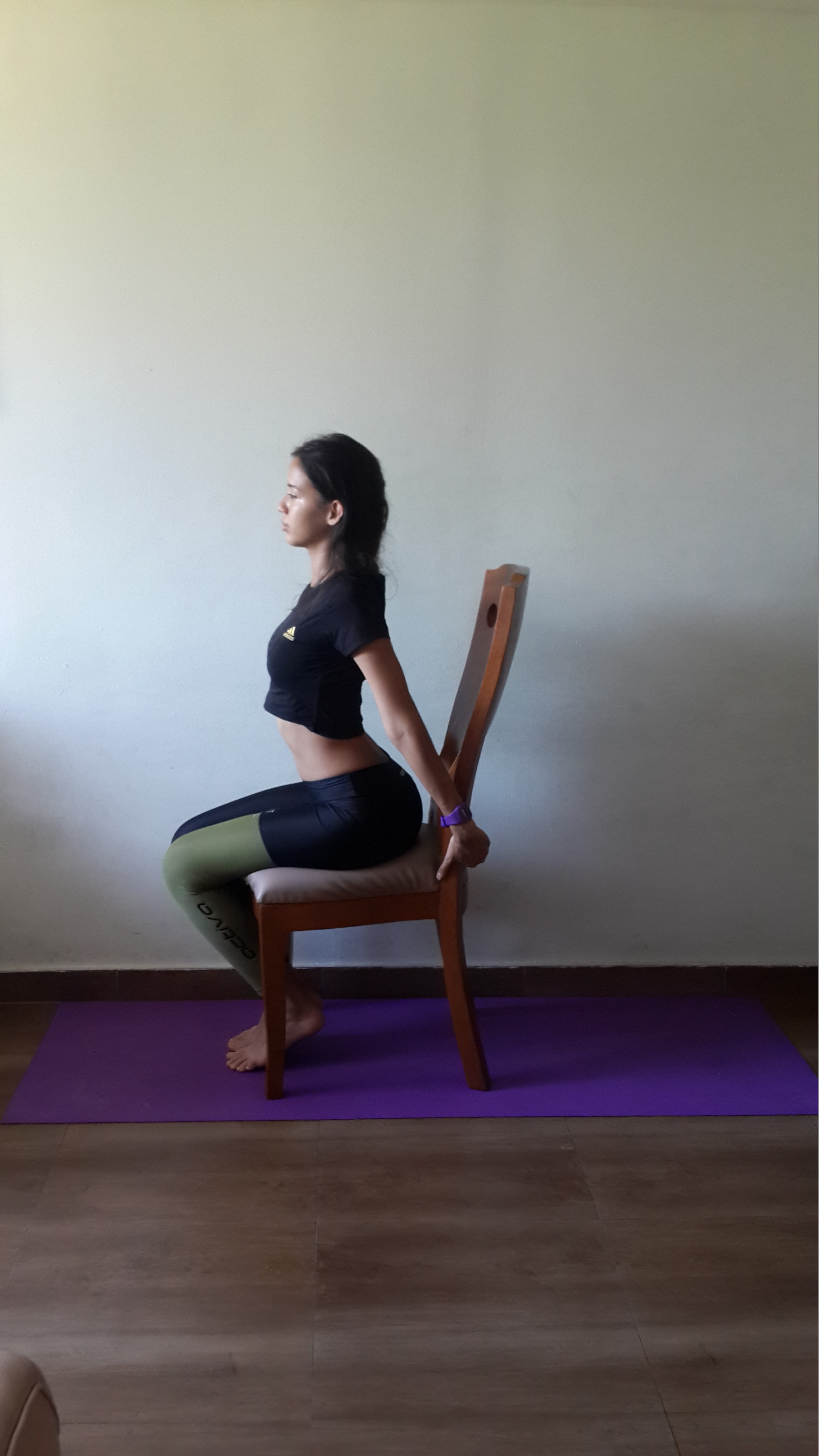 이 운동에서는 의자에 앉아서 가슴을 앞으로 뻗어 어깨를 뒤로 젖 힙니다. 등받이를 붙잡을 수 있습니다.