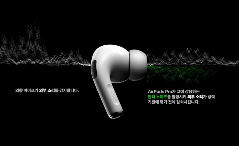 에어팟 프로는 '프로'라는 수식어가 붙은 만큼 기존 에어팟과 다르다. 가장 큰 특징은 액티브 노이즈 캔슬링 적용이다. 외부 소음을 인식하고 상쇄시킬 수 있는 파동을 일으켜 잡음을 없애는 기술이다. 지하철, 버스 등 반복적인 소음이 있는 곳에서 유용하다. 기능도 켜고 끌 수 있다. 포스 센서를 터치하면 주변음 허용 모드로 전환된다.