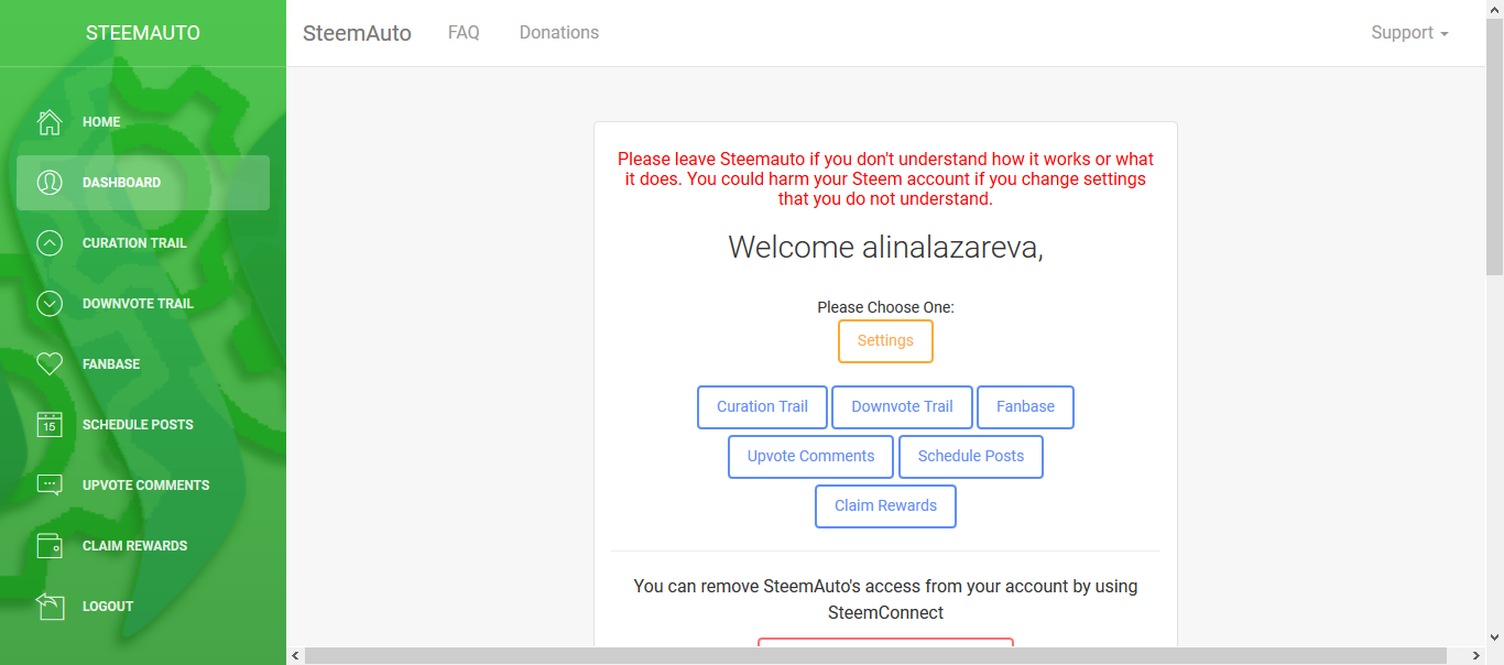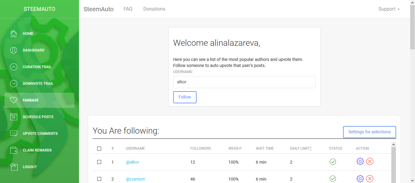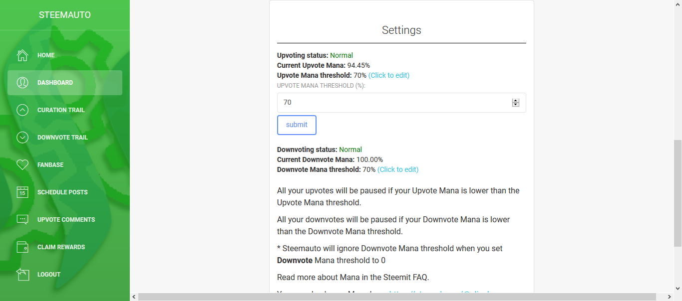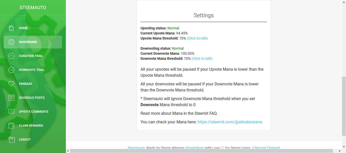 И попадаем в админку. В первую очередь заходим в настройки и меняем уровень Upvote Mana threshold (это когда бот перестает голосовать и становится на подзарядку)