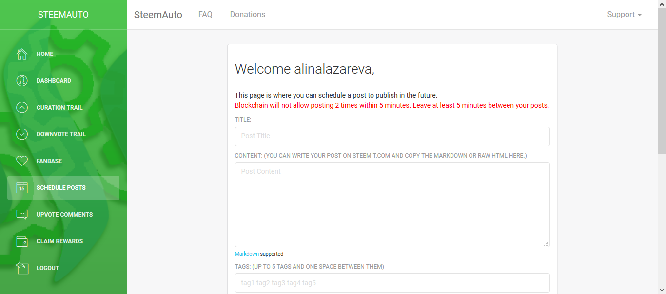 Из дополнительных плюшек - планировщик постов. Тут все тривиально, сделал пост, указал когда отпостится и забыл. Я в стимите ползаю через SteemPeak где кроме планировщика еще и постов шаблоны есть, так что эту функцию не использую. И да, там есть напоминание, что нельзя постить чаще чем раз в пять минут.