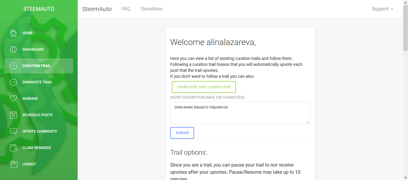 Далее рассмотрим функцию паровозов. Создать свой клинически просто, нажимаем Create/Edit your curation trail вводим описание, нажимаем Submit - все, ваш паровоз готов и все кто присоединится к нему будут следовать за вашими апами.