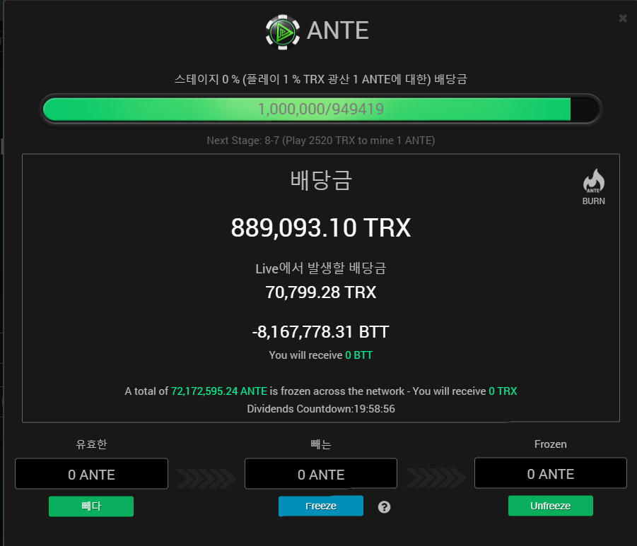 FREEZE(얼림)하게 되면 한국시간으로 오후1시에 ANTE 코인에 대한 배당금을 받을 수 있습니다.