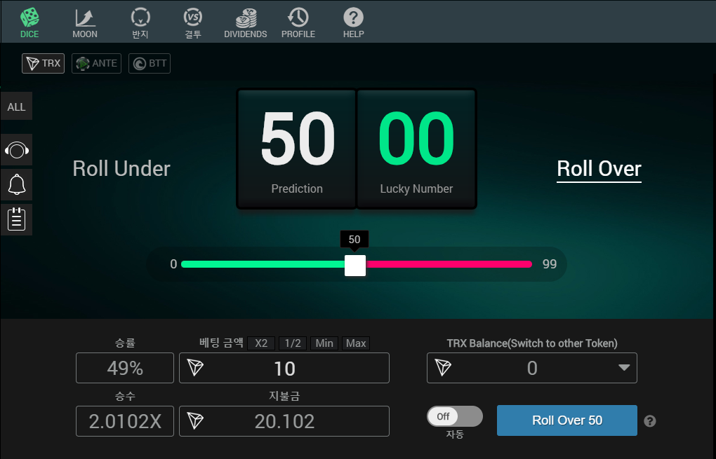배팅금액은 최소 10개의 트론(TRX)코인으로 시작할수있으며, 1~100 숫자중 오버(Over) 또는 언더(Under)에 선택가능하며