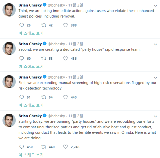 브라이언 체스키 에어비앤비 CEO는 최근 자신의 트위터에 파티 하우스 임대를 금지한다며 "우리 회사는 악의적인 고객과 호스트의 행동, 승인받지 않은 파티 위험성과 싸우기 위해 응분의 조치를 하기로 했다"라고 밝혔다.