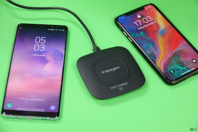 (왼쪽부터)삼성 갤럭시노트8, 슈피겐 고속무선충전기 F301W, 애플 아이폰X