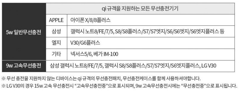 아울러 Qi 규격을 지원하는 모든 스마트폰을 충전 가능하지만 고속무선충전 기능 지원 여부도 따져봐야 합니다. 삼성 갤럭시노트8과 LG V30은 9W 고속무선충전을 활용할 수 있지만 아이폰X, 아이폰8은 5W 일반무선충전으로 이용 가능합니다.