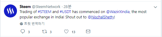스팀 트윗터에 올라온 내용입니다. 인도의 거래소에 스팀이 상장되었다는 군요!