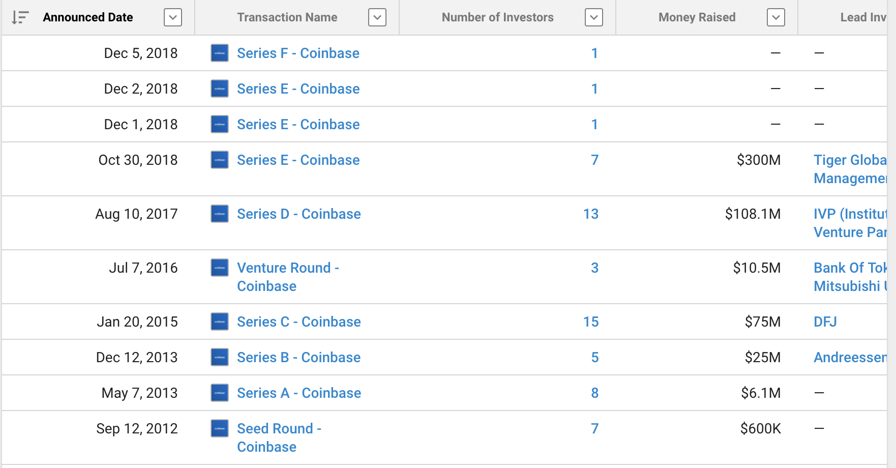 코인베이스는 아래 보이는것처럼 시리즈 F까지 (이후 펀딩도 있는것으로 알고 있네요) 53개 기관에 촘촘히 투자를 받았습니다.