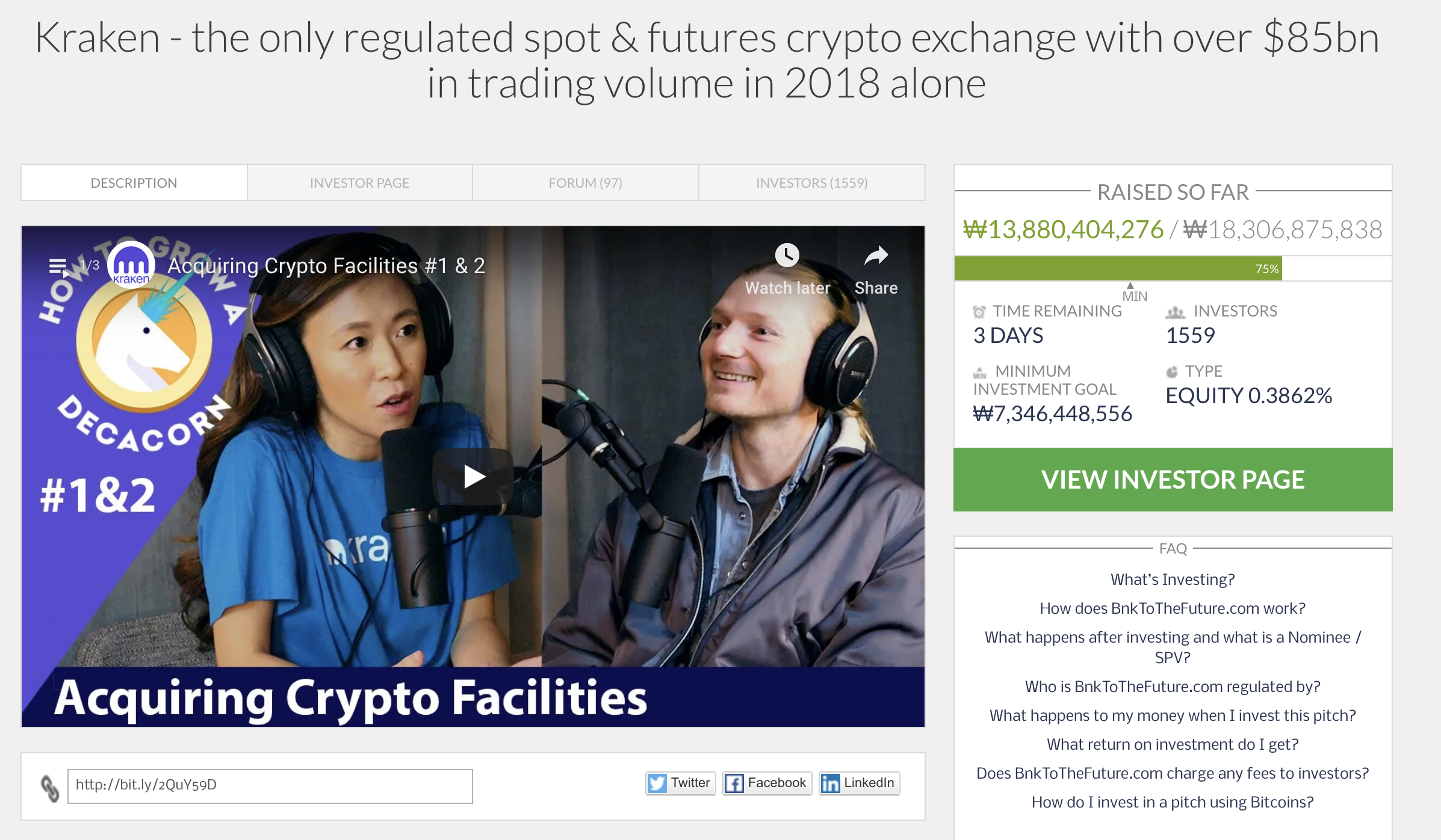 BFT에서는 현재 크라켄 회사의 주식을 판매하고 있습니다. 현재 1,559명이 참여하여 약 140억원의 금액이 모금되었네요. 기한이 3일 밖에 안남았고 조금전 크라켄 회사에서 회원들에게 이메일을 쏴서 크라켄 주식딜에 참여한 회원에 관한 혜택을 언급했네요.