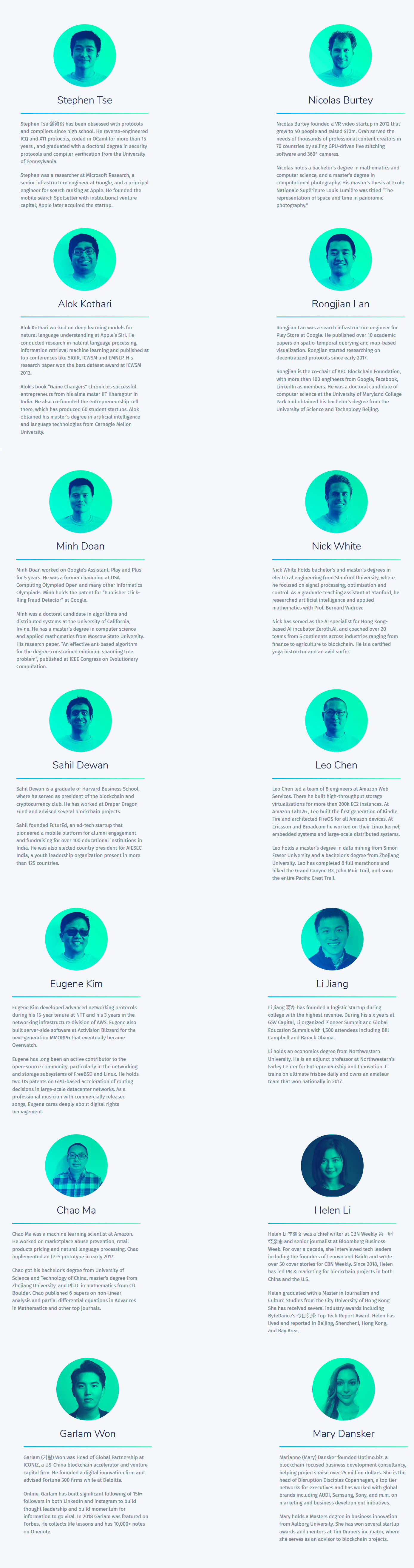 구글&애플&아마존 출신 엔지니어들이 설립한 블록체인 스타트업이며, 홍콩 호주 싱가폴 실리콘벨리 등 글로벌 펀드로 약 180만달러 규모 투자를 유치