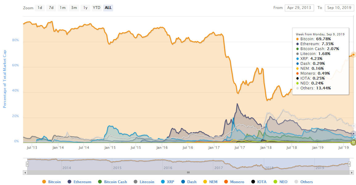 글로벌 주식·암호화폐 거래 플랫폼 이토로(eToro)의 수석 애널리스트인 마티 그린스펀(Mati Greenspan)은 트위터를 통해 "비트코인의 시총 점유율(~70%)이 알트코인 마켓이 본격적으로 성장하기 이전의 수준과 맞먹는다. 향후 비트코인이 추가적인 강세를 나타나기 힘들 것"이라고 지적했다.