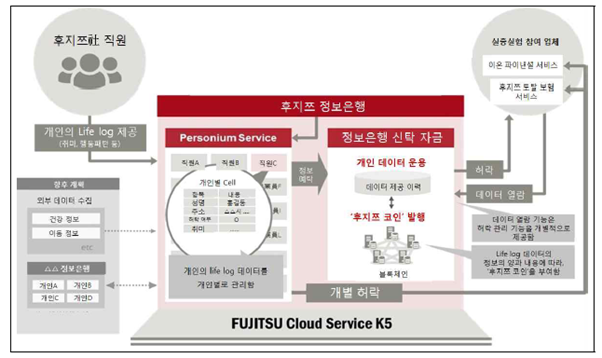 정보은행 제도를 본격적으로 시작하기 앞서 민간에서도 여러가지 실험이 이루어 졌는데, 일본 후지쯔社의 사내 직원들을 대상으로 한 정보은행 실증 실험을 보면 소비자의 개인정보를 수집해 민간 기업에 제공하는 ‘개인정보은행’ 서비스를 시작한다. 온오프라인 구매이력이나 이주 기록, 건강 상태와 같은 개인정보를 제공하는 소비자에겐 현금이나 서비스 이용권 등을 대가로 지급하게 됩니다. 이것이 우리나라 마이데이터 사업과 다른 점 입니다. 물론 해당 실험은 2017년 이루어 졌지만, 블록체인과 토큰을 감안한 모델이라는 것을 감안했을 때 우리가 참고해 볼만 하다고 생각합니다.