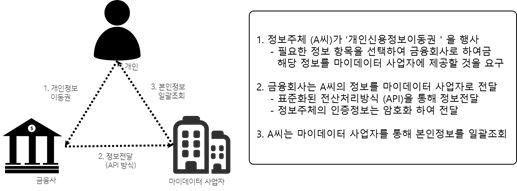 위의 그림에서 보는 것처럼 마이데이터 사업은 일반 금융 소비자들의 금융 활동으로 인해 발생하는 빅데이터를 이용한 부수적인 사업을 추진하겠다는 얘기입니다. 기업을 중심으로 이루어 지던 데이터의 활용 과정에서 정보의 원 소유자인 개인에게 혜택을 줄 수 있다는 얘기입니다. 이를 개인정보의 자기 결정권이라고 하며, ‘개인신용정보이동권’이 금융활동에서의 의사결정에 활용될 수 있게 스스로 통제/관리해 개인의 정보 주권을 실질적으로 보장한다는 취지입니다.